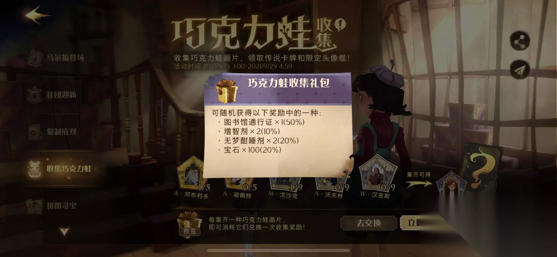三、巧克力蛙活动活动奖励: (1)图书馆通行证*50%几率获得 (2)增智剂2个10%几率获得; (3)无梦酣睡剂2个20%几率获得; (4)宝石100,20%几率获得;