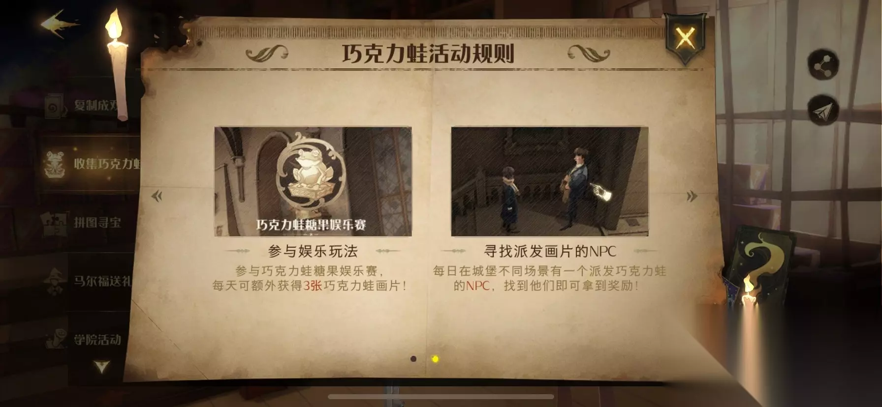 二、巧克力蛙活动规则 (1)、参与与每天的活动可以获得巧克力蛙; (2)、参与巧克力蛙糖果娱乐赛可以额外获得3张巧克力蛙画片; (3)、寻找当日的寻找派发巧克力蛙的NPC,可以获得奖励;