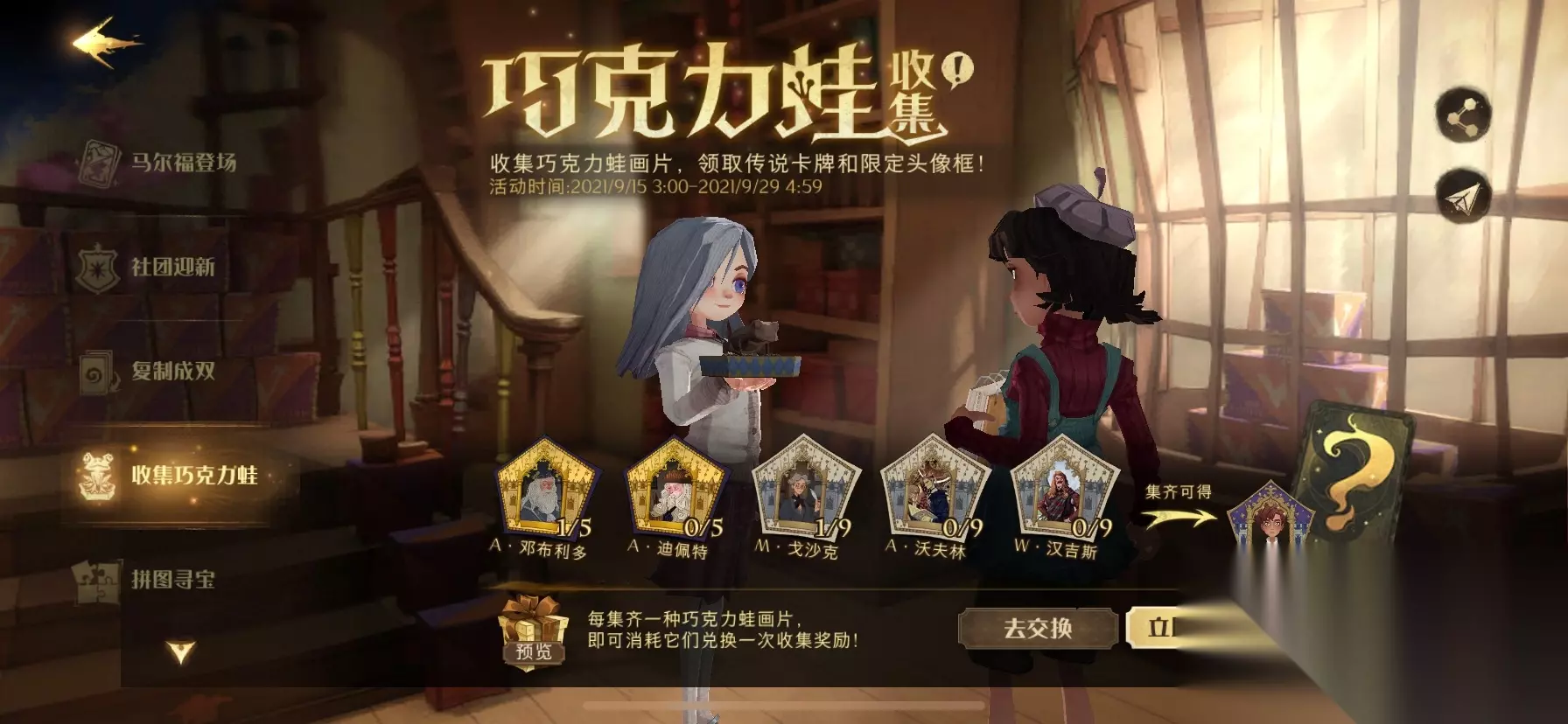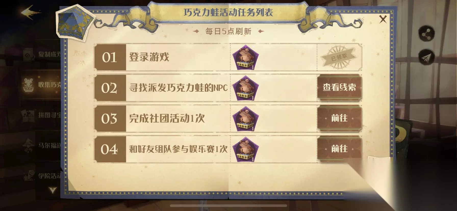 一、巧克力蛙每日收集任务: 1、登陆游戏+1 2、寻找派发巧克力蛙的NPC+1 9.23派发巧克力蛙的npc: 9.23派发巧克力蛙线索: 9.25派发巧克力蛙的npc:草药课堂纳威 9.25派发巧克力蛙线索:当地狱结冰了我才会加入你们 9.26派发巧克力蛙的npc: 9.26派发巧克力蛙线索: 9.27派发巧克力蛙的npc:点击查看 9.27派发巧克力蛙线索:巧克力蛙画片里的人物包括霍格沃兹的数任校长。 9.28派发巧克力蛙的npc:点击查看 9.28派发巧克力蛙线索:点击查看 3、完成社团活动1次;() 4、和好友组队参与娱乐赛1次