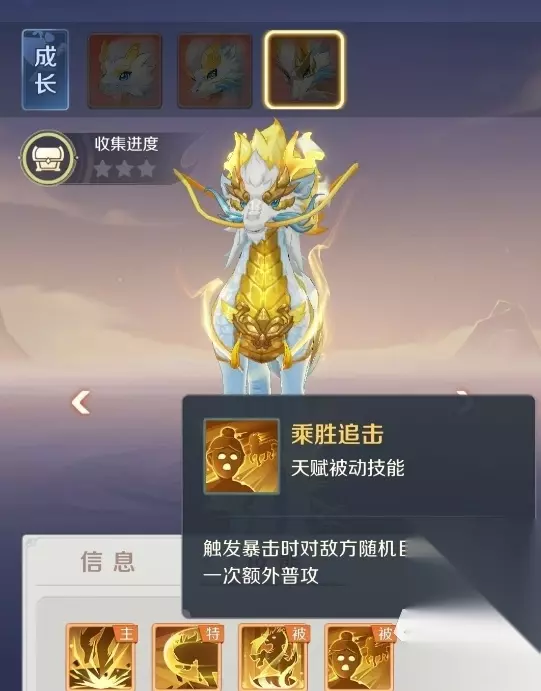 龙马的核心优势集中于两大被动能力。被动【同仇敌忾】赋予其独特的团队协同增益效果:每次出手时,我方每只灵兽均有10%概率为其提供“等级×2”的物理攻击加成。若全部队友均成功触发该效果,单次攻击将叠加高达数倍的基础物攻,瞬间打出远超常规预期的爆发伤害,令对手难以预判实际输出阈值。另一被动【乘胜追击】则强化其连续作战能力——只要龙马本次攻击触发暴击,即额外对敌方随机一名目标发动一次普攻。该效果不占用技能栏位,且触发门槛较低;当暴击率稳定在50%以上时,实战中频繁连击成为常态,甚至可实现“次次暴击、次次追击”的高效清场节奏。