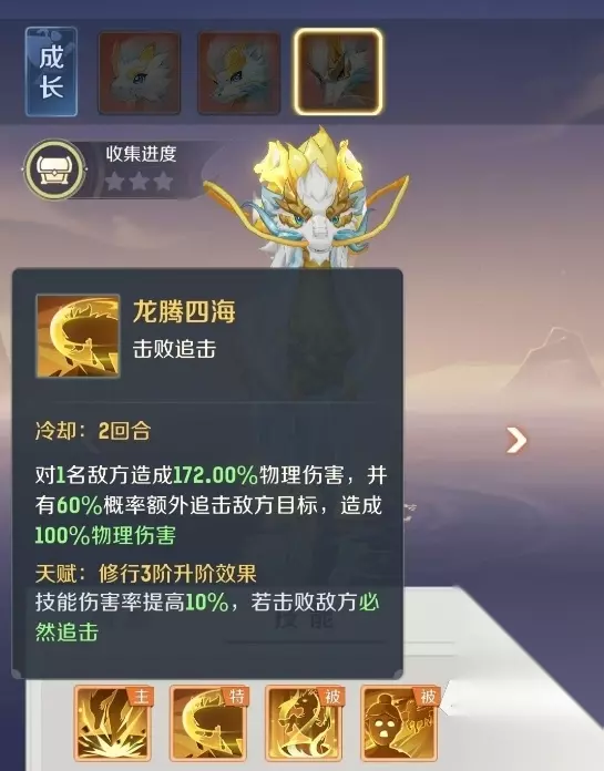 主动技能方面,【龙吟劈岳】作为主力单体输出技,具备高基础倍率,并支持多阶修行强化:在修行达到2阶与5阶时,技能伤害获得阶梯式提升,确保龙马在不同养成阶段均能维持稳定的点杀能力。而【龙腾四海】则是其核心收割手段,除造成高额单体伤害外,还附带60%概率的追加普攻;当修行至3阶后,该技能在成功击杀目标后,必定触发一次强制追击,自动锁定敌方剩余单位,大幅提升残局终结效率与战术容错率。
