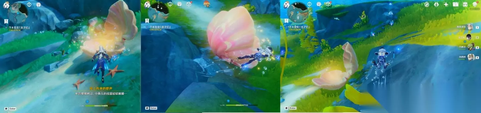 本任务解谜不多,对话剧情较长。 任务流程 【佩妮做了个梦,也不全是梦。】 ▌ 1 ▷ 尝试理解唐·西哈诺和娜娜的话 靠近即可进入剧情。 ▌ 2 ▷ 与佩妮对话 ▌ 3 ▷ 下水见见「孩子们」 靠近三处贝壳触发剧情。