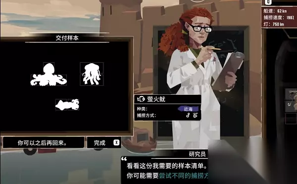 2、任务要求玩家找标本*3,标本分别是海月水母、萤火鱿、发光章鱼。