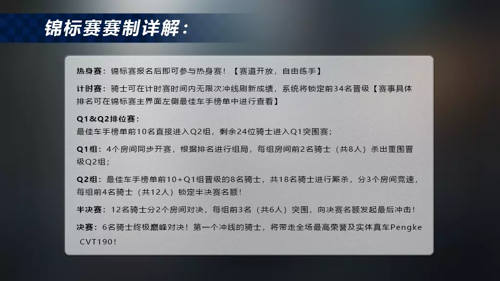 从排位赛到总决赛,每一次过弯都是生死局,每一脚油门都在改写纪录——骑士们,让引擎的嘶吼告诉世界:谁是赛道真正的王!