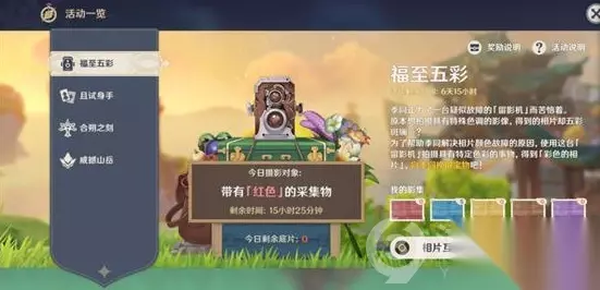原神完美留影任务怎么完成?原神完美留影任务怎么做?很多玩家对此还不清楚,那么接下来小编就为大家分享一下原神完美留影任务完成攻略,希望能够帮助到大家,一起来看看吧! 完美留影任务: 第一天的留影机任务要求是拍摄红色采集物。 要求五种颜色的相片。 拍摄的对象必须是采集物!(所以不要再对着火之神神乐或者爆炎树乱拍了kora!) 推荐拍摄物品 朱红:烈焰花(活的)位置:风本旁边 绝云椒椒 位置:轻策庄传送点下石梯左 丹青:落落莓(白天)位置望风角传送点矿山下方 土黄:胡萝卜 (最好选裸露出来的,比如从箱子里打出来的) 金鱼草 位置:奔狼领传送点往下的河边,快腿罗斯旁 褐色:苹果(晚上)位置:望风山地传送点往北有棵苹果树 霓裳花 位置:望舒客栈楼下 紫色:落落莓(晚上) 每天只能拍10次,务必不要手抖。 另外,建议把十次用完,因为每次都是这几种相片兑换(理论上今天可以换两次),但是明天的主要颜色可能会有改变,静观其变。