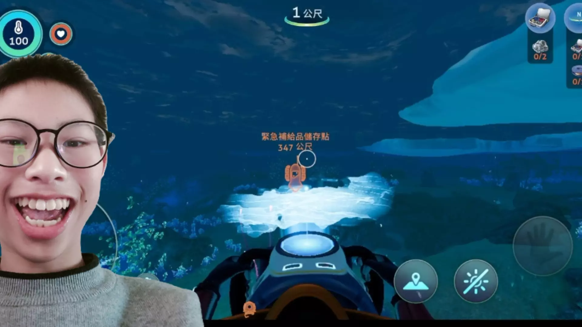 这是生存游戏《深海迷航》的游玩内容,玩家开启赛博赶海之旅,在深海探索收集钛矿石等材料,目标获取水下推进器,过程中展示了深海场景与游戏内的合成系统。