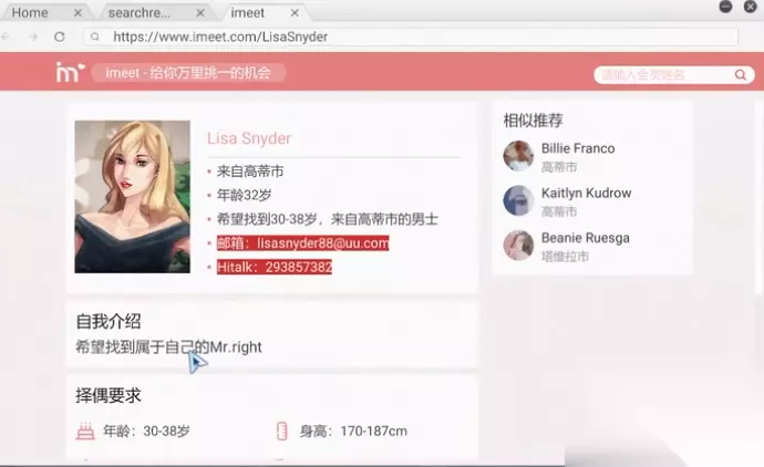 5、之后我们搜索lisa的imeet,得到他的邮箱和hitalk(类似微信)账号。