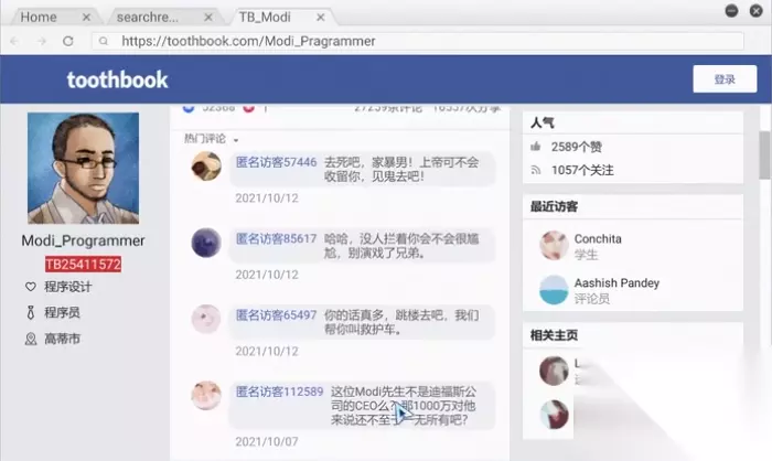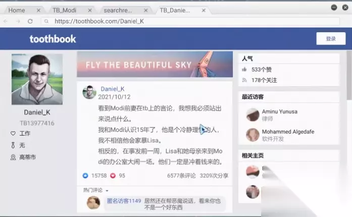 3、之后我们打开浏览器搜索将modi的姓名进行搜索,先打开推特,我们可以获得modi的推特账号、常用昵称以及他对妻子的评价。