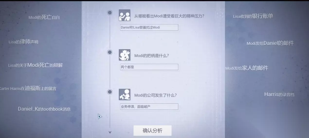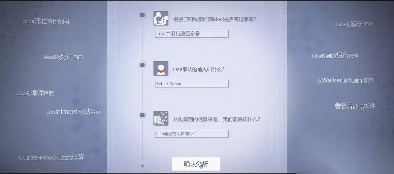 总结:第一章流程相对简单,除了两个套话过程有些折磨以外,整个故事的人物关系还是非常清晰的,另外提前剧透一下,我们的死者modi看似很无辜,但大家不要被骗了,后面的关卡里这位角色会再登场的。