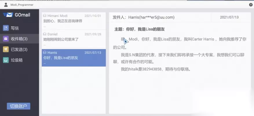 10、此时我们可以根据modi的信息,得到他的常用密码,并登录邮箱,搜集到他的hitalk。