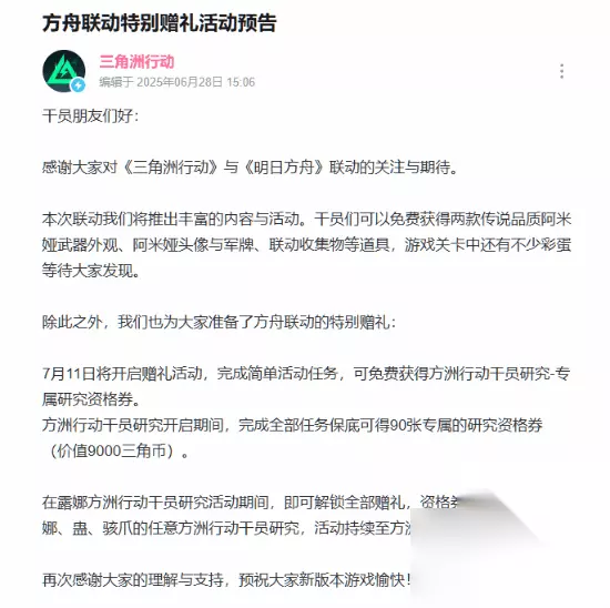 干员朋友们好: 感谢大家对《三角洲行动》与《明日方舟》联动的关注与期待。 本次联动我们将推出丰富的内容与活动。干员们可以免费获得两款传说品质阿米娅武器外观、阿米娅头像与军牌、联动收集物等道具,游戏关卡中还有不少彩蛋等待大家发现。 除此之外,我们也为大家准备了方舟联动的特别赠礼: 7月11日将开启赠礼活动,完成简单活动任务,可免费获得方洲行动干员研究-专属研究资格券。 方洲行动干员研究开启期间,完成全部任务保底可得90张专属的研究资格券(价值9000三角币)。 在露娜方洲行动干员研究活动期间,即可解锁全部赠礼,资格券可用于参与露娜、蛊、骇爪的任意方洲行动干员研究,活动持续至方洲行动干员研究结束。 再次感谢大家的理解与支持,预祝大家新版本游戏愉快!