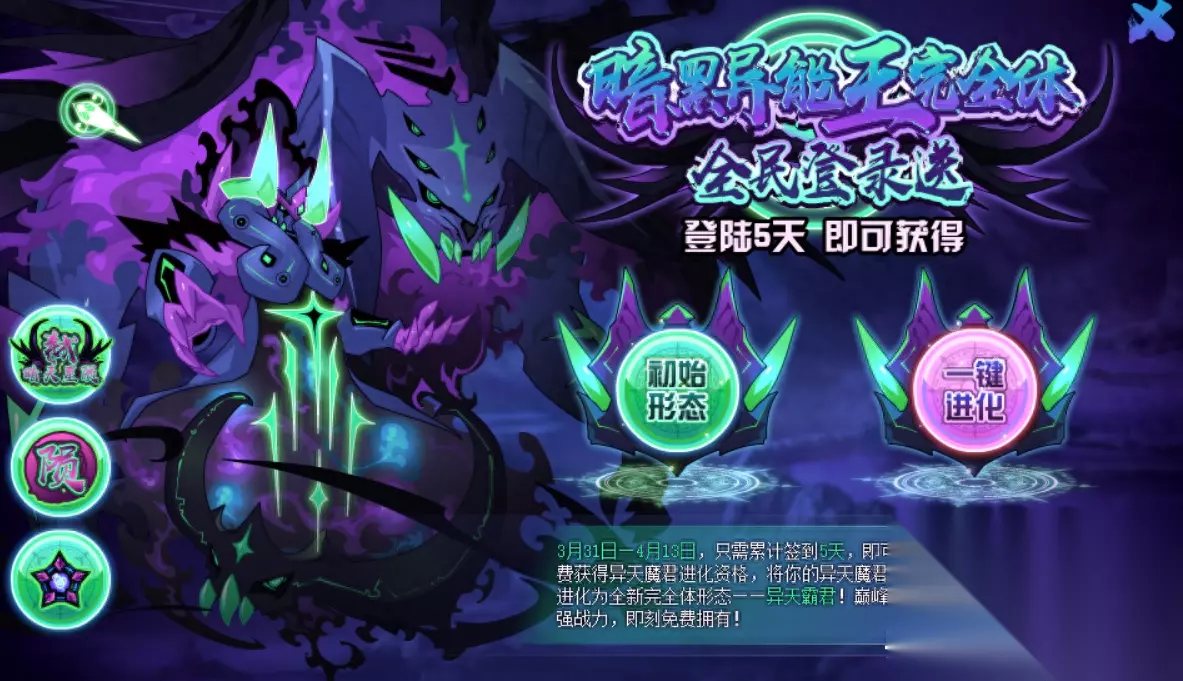 异天魔君 提起异天魔君很多上古玩家可能不熟悉,但是要是提到他的另一个名字就有很多人知道了,他就是【暗黑异能王】,是赛尔号早期异能星剧情中登场的反派,2011年的时候,赛尔号推出了异能精灵的概念以及玩法。