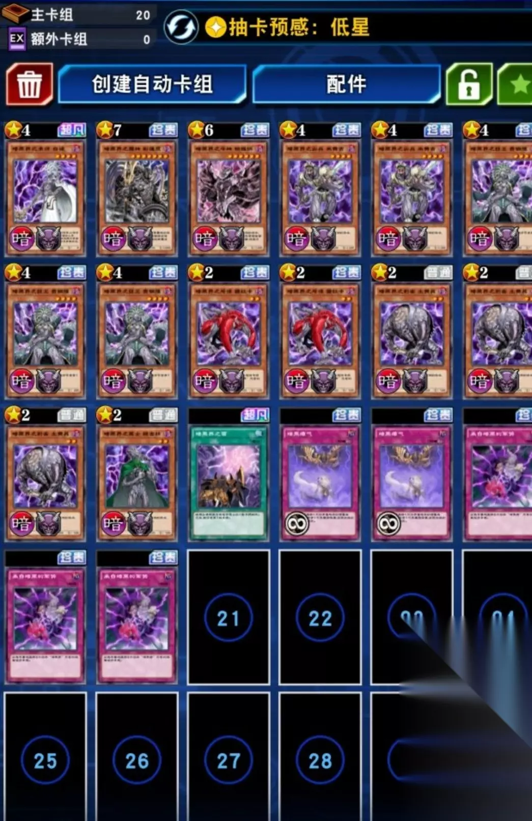 1.卡组建议 先来看卡组,两张暗黑瘴气可以在对面回合给对面造成困扰并且丢自己手牌。别带了,两张暗黑界土黄配合暗黑瘴气给对面炸卡。下阶的卡都是携带一些平常暗黑界系列的怪兽卡。 国服的暗黑界没有终端,所以只能依赖一些其他的途径完成暗黑界的基本打法。首先暗黑界的卡都非常的氪金,而且暗黑界很多卡都还没出来,所以说在国服是基本非常冷门。