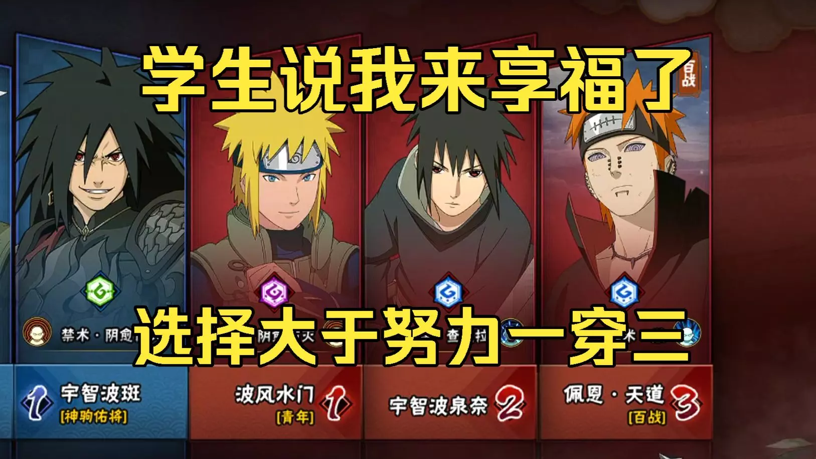 这是《火影忍者手游》的决斗场对战内容,展示了自定义阵容选将环节,以及忍界大战迈特凯与宇智波斑[神驹佑将]、宇智波斑[白面具]的精彩对战,还出现了迈特凯“我的青春没有后悔”的经典台词。