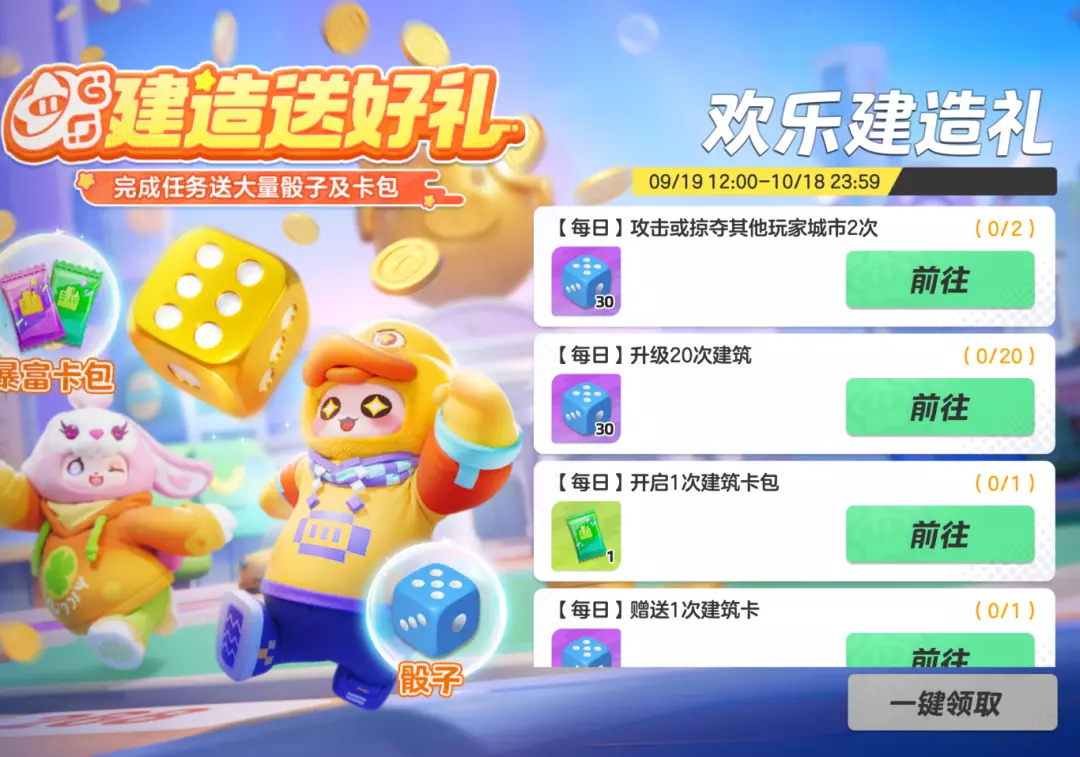 即可领取骰子和天天暴富建筑卡包
