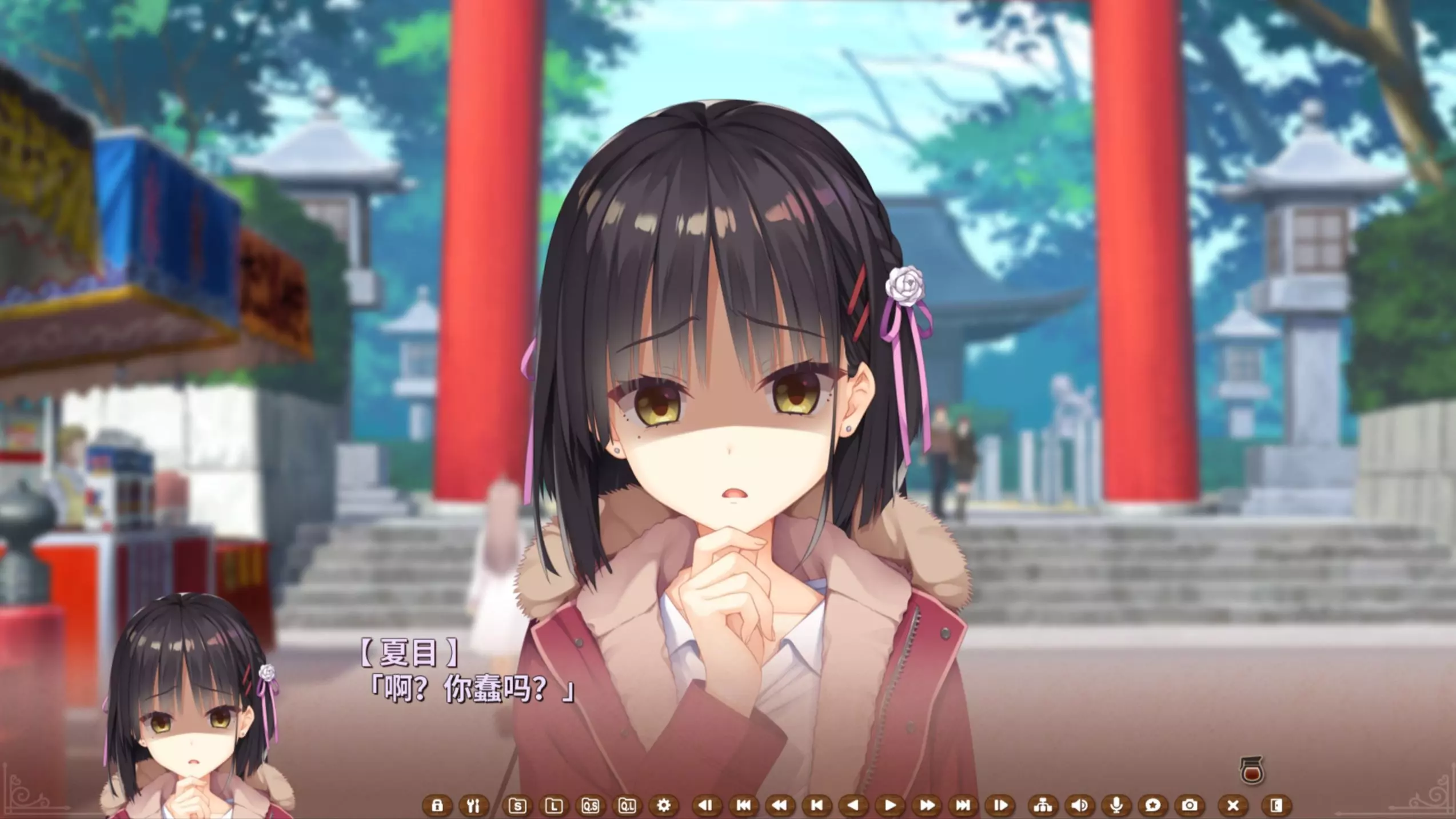 这是柚子社游戏《魔女的夜宴》Chapter 6-4的剧情片段,柊史和䌷在商场对话,䌷笑着说起自己买下衣服却没法穿上,还提到小时候打扮成男生模样,打破了自己之前不会笑的说法。