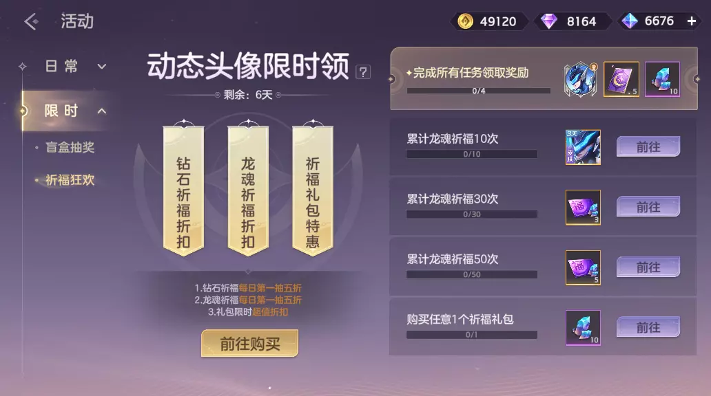 钻石祈福首抽限时5折(每日刷新),龙魂祈福首抽限时5折(每日刷新),祈福礼包限时特惠,完成全部任务可获得动态头像银河彼端·黄月英等奖励。