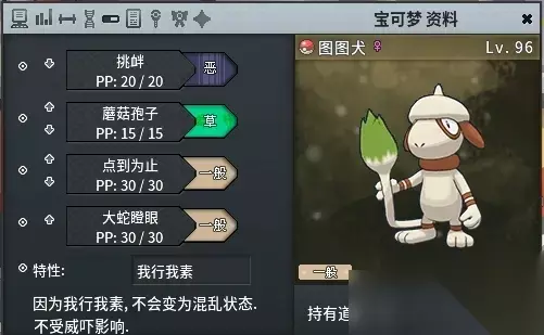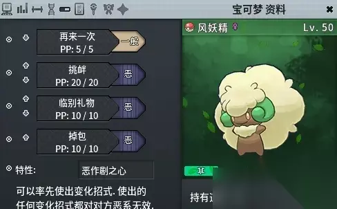 配招推荐: 大蛇瞪眼:百分百命中麻痹(无法作用于电系精灵,通过阿柏蛇写生) 蘑菇孢子:百分百命中睡眠(无法作用于草系精灵,通过败露球菇或斗笠菇写生) 挑衅:封锁回血等变化技 浸水:使得蛮干打不中的幽灵属性变得可以打到 所有变化技能用一个图图犬就可以解决。注意头目野性之力后,图图犬可能没法先手,要么携带气势披带、要么携带围巾、要么直接首发。 4.3 风妖精/木棉球,必定先制的变化技能 风妖精(配招以文字为准!)