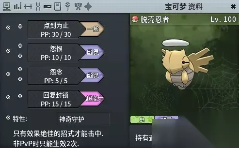 特性:恶作剧之心 配招推荐: 麻痹粉:75命中,无法作用于草系和电系精灵,相比于蘑菇孢子,虽然命中不满,但是一定可以先手 挑衅:封锁对方回血等变化技能 再来一次:锁某技能 掉包:携带围巾锁技能 4.4 脱壳忍者,拖回合的好手 脱壳忍者(配招以文字为准!)