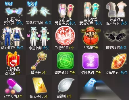 仙度瑞拉双飞翼(永久)、星轨双飞翼(永久)、守护之神芳香国度(永久)、兰心悠悠爱情海岸(永久)、纯洁祷告布艺绝伦(永久)、蓝心拂晓(永久)、冰雪物语(永久)、飞行印章1个、大福神7天、暗夜降临(永久)、光彩水晶对戒盒1个、魔法棒1个、碧波涟漪1个、旋风轨迹1个、金辉宝石(永久)、动力药丸1个、黄金卡片1个、白银叶2个、点券240个、宠物币150个 以上就是本期活动的全部内容,这期活动的奖励都听不错的哦。小伙伴们感兴趣的话可以抽一些。