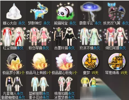 暖心大白(永久)、梦醉神灯(永久)、熊猫阿宝(永久)、霹雳浮云(永久)、妖灵双飞翼(永久)、红尘微醺(永久)、粉恋琴音(永久)、古墨铃猫(永久)、玖沫不惜(永久)、绚烂阿狸(永久)、极品罗小黑1个、极品马上有钱1个、极品甜心粉兔1个、童梦(15天)、琴意绵绵(15天)、凡客潮人/骷髅蝴蝶结(永久)、蓝鲜丽熙/素子花纱(永久)、桃情如画/冰雪梦颜(永久)、青春年华、假日鹅黄(永久)、烈日凤金羽(永久)
