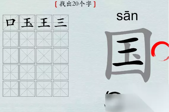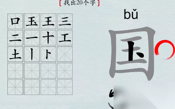 汉字神操作国找出20个字攻略 关卡要求: 关卡会分享一个国字,玩家需要在这个字里找到20个字 通关攻略: 1、寻找技巧:拆字法,可以将【国】拆成【口】字和【玉】字,同时也可以将【玉】拆成【卜】字和【三】。