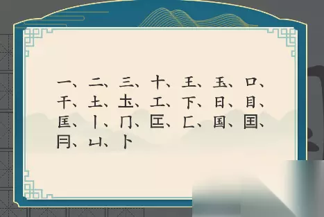 3、最后只要再增添一些【�G、�M、�搿�小③伞可�僻字就能凑够20个字了,如果还没有过关的话就来看看下面的正确答案吧。 国字能找到的所有汉字为: (1)一、二、三、十、王、玉、口、干 (2)土、�M、工、下、日、目、匡、丨 (3)门、�G、匚、国、�搿�小③伞⒉�