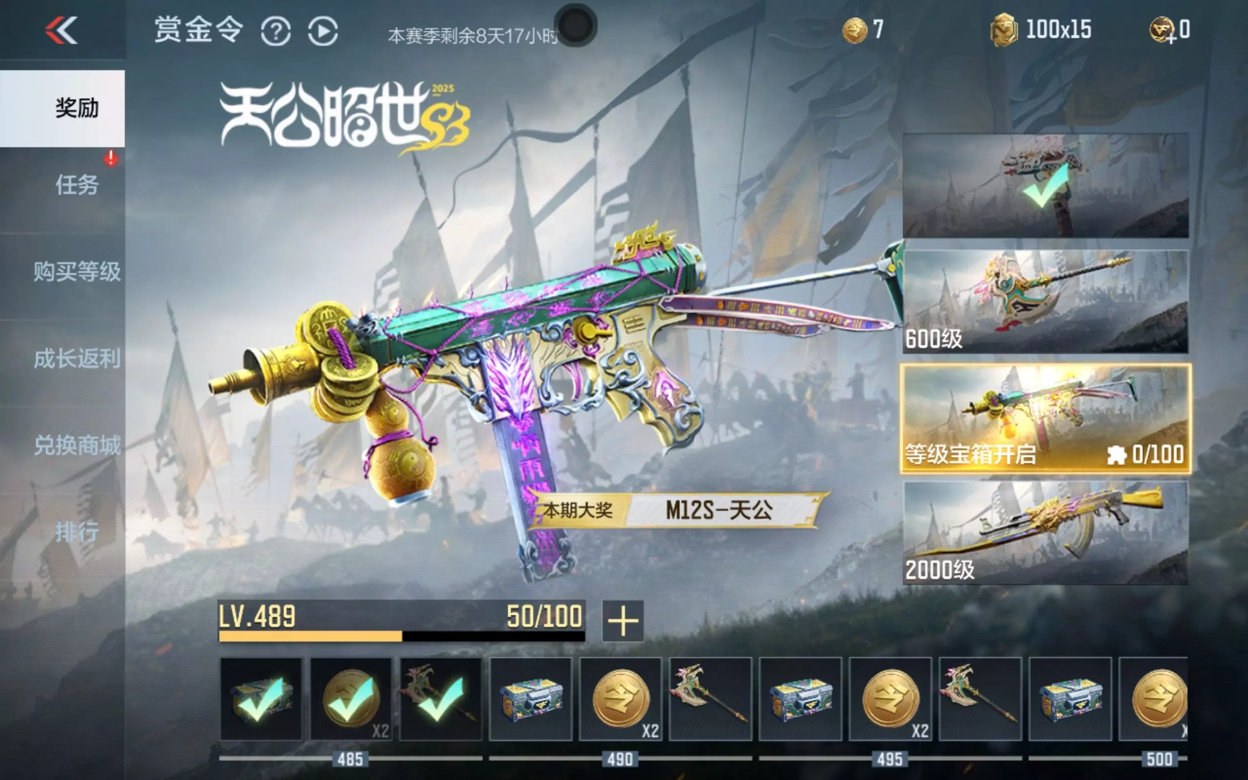 随着等级继续飙升,奖励也随之升级,25级可解锁2025-天公珍藏×2,50级再得2025-天公珍藏×2,冲破100级有2025-天公珍藏×3稳稳入账,150级时奖励翻倍,2025-天公珍藏×5收入囊中,若能到达250级,2025-天公珍藏×8等你来拿,而当你冲刺到500级,2025-天公珍藏×10便是对你实力的加冕。