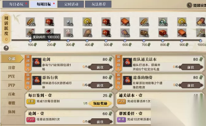 2、升级顺序建议 当完成剧情任务、到达72级后,在屏幕右上方、地图旁边,就可以呼出活动日历,在每日必玩中查看“门派打坐”和“怪物阅历”,在每周目标中查看周活跃度完成情况。 其中,周活跃度奖励是根据每周一或角色每周初次开启这一功能时的等级、装备情况确定的。 通过完成特定的行为,可以获得活跃度,进而获取周活跃度奖励。每达到100活跃度,都会获得阅历奖励。这一奖励在本周日前不会变化,因此,建议诸位少侠先行获取这一部分阅历、提升等级。 门派打坐和怪物阅历,都可以在活动日历中的“每日必玩”中看到具体情况。 其中,门派打坐是前往门派接取人出对话、开启打坐、获得阅历: 这一玩法每日获取阅历和当前等级有关,每日10点刷新,可存储3日。 而怪物阅历则是通过击杀怪物获取。在话本中击杀boss也是可以获取的: 和门派打坐相同,怪物阅历每日获取量也和当前等级有关。不过,可以叠加7日。 另外,门派打坐可以通过上班族减负令·壹迅速完成,怪物阅历则是通过减负令·叁完成,这两种道具都可以在商城中购入。