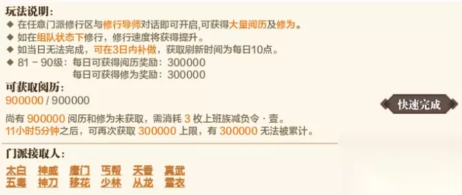 3、等级封印 为了平衡游戏进程,少侠到达一定等级时,会开启等级封印,暂停修为的获取。这时建议诸位少侠根据等级封印时间,存储门派打坐和怪物阅历——这样一来,在打开等级封印的时候,就可以循序获取阅历、提升等级了。 4、总结 升级顺序建议: 门派和剧情任务——每周活跃度提升——门派打坐和怪物阅历。在触发等级封印时,适当存储门派打坐和怪物阅历。 为了更便捷高效地提升功力、战力,有些内容建议诸位少侠每日尽量完成。