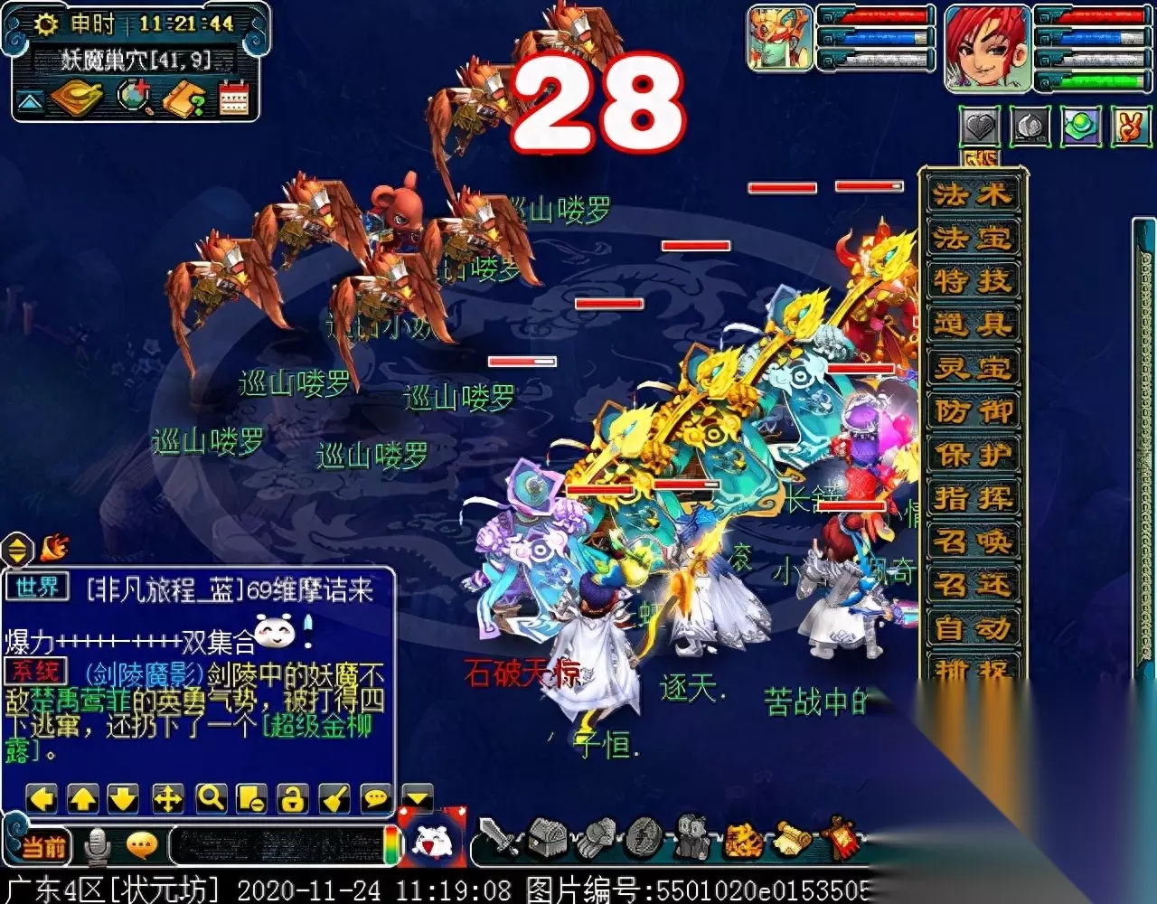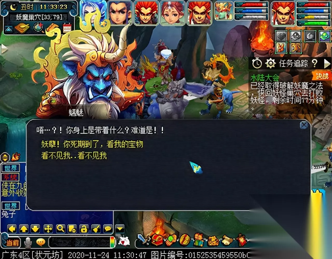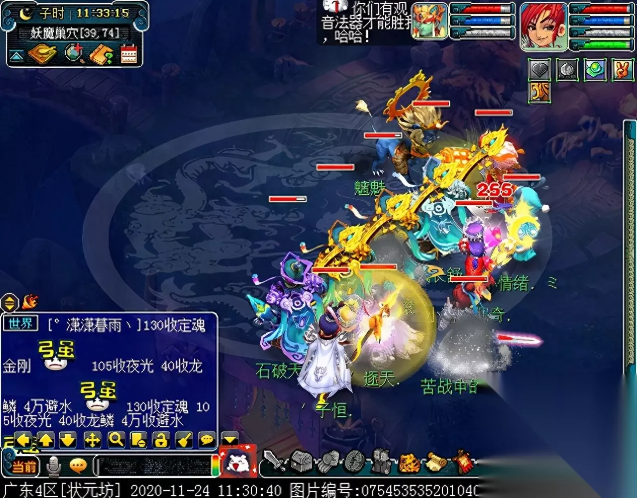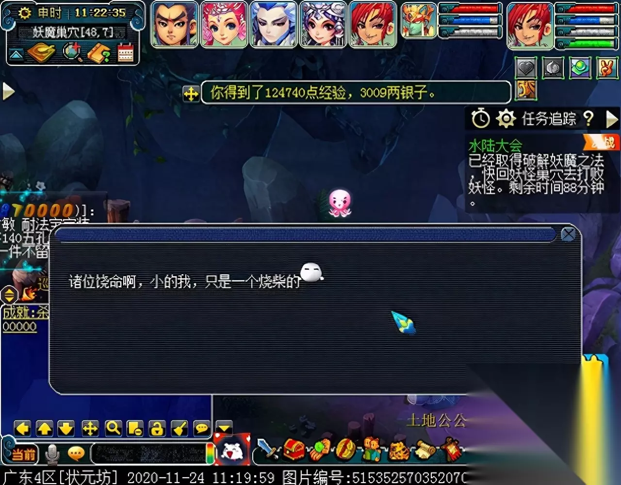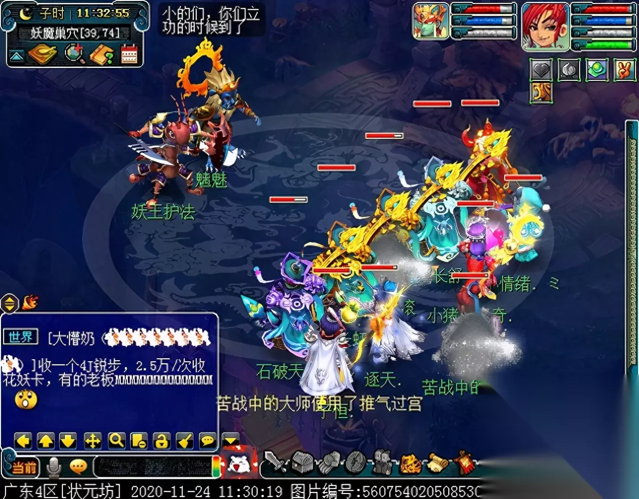 战斗胜利后,如果你是想一队内外夹攻的话,直接点击土地公公传送到妖魔巢穴,后面杀BOSS时当主怪冒泡讲话后,需要领取法宝的玩家跑出来点击魑魅魍魉使用法宝,逃跑出来的玩家会出现在巢穴入口,需要跑上去点,这样的话,跑出去的玩家会损失掉一份奖励。 如果选择小号与队伍内外夹攻的话,那队长就飞出副本场景,这时法宝会消失,小号可以在队伍杀主怪时跑去幻化的观音那重新领取法宝,协助击杀主怪,笔者选择的是后一种方式。 下面开始清理小怪。