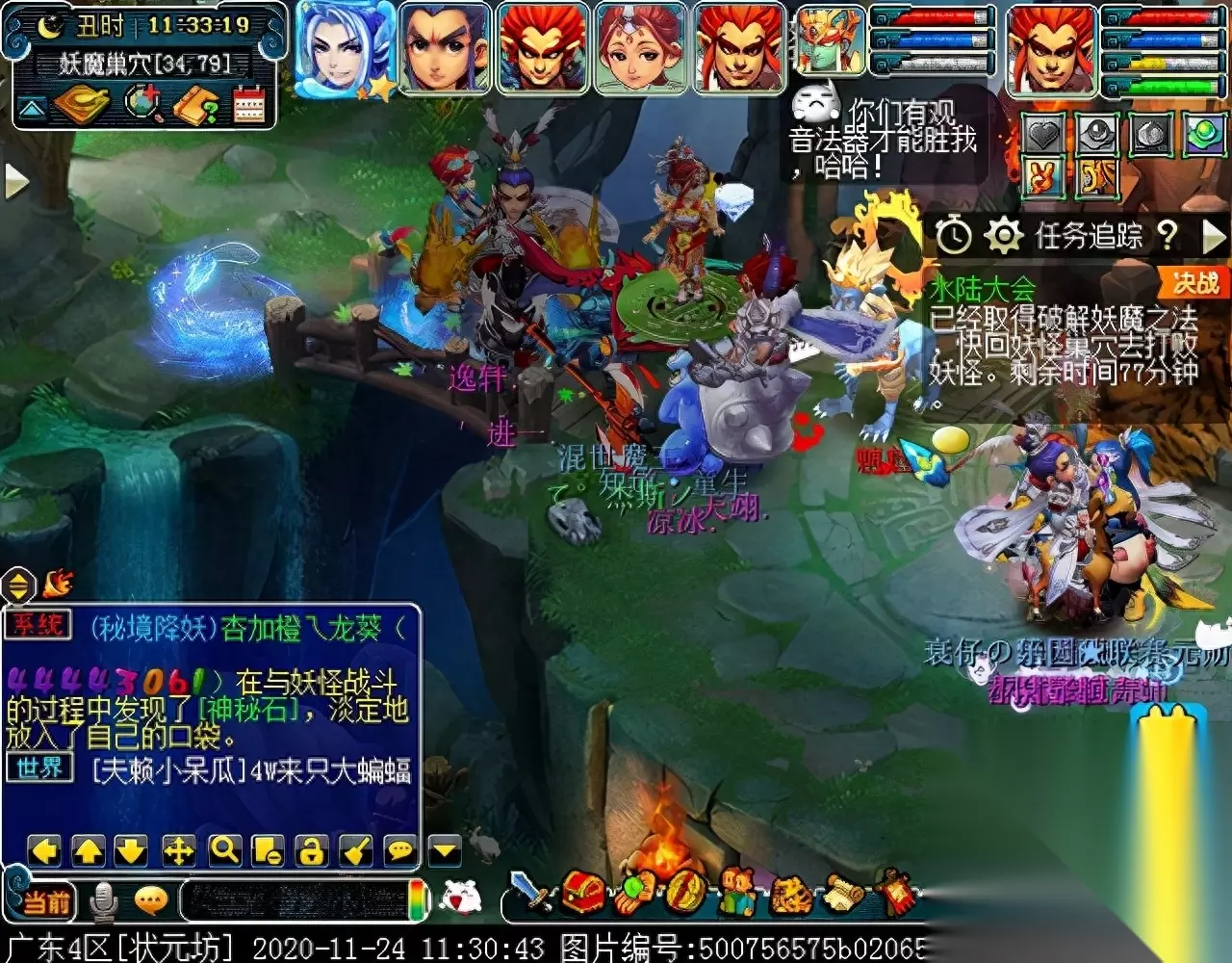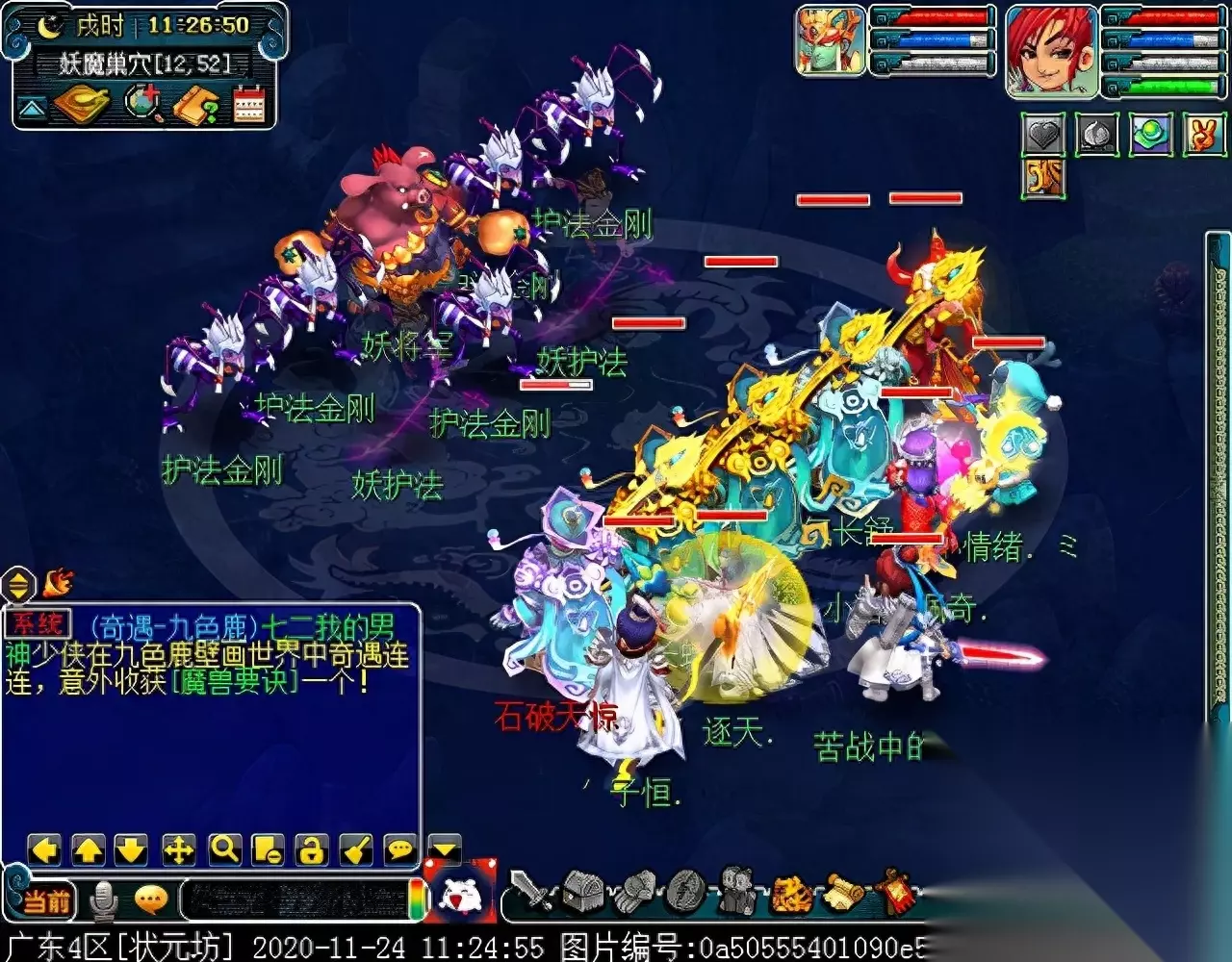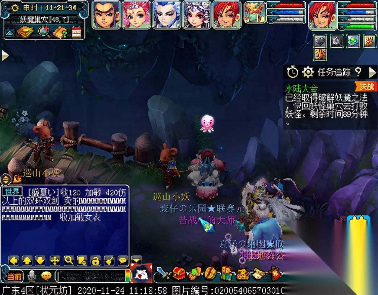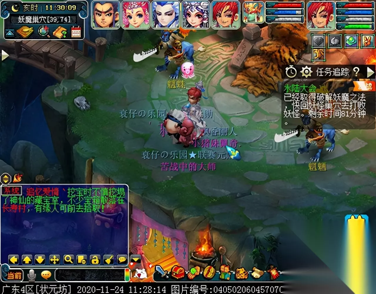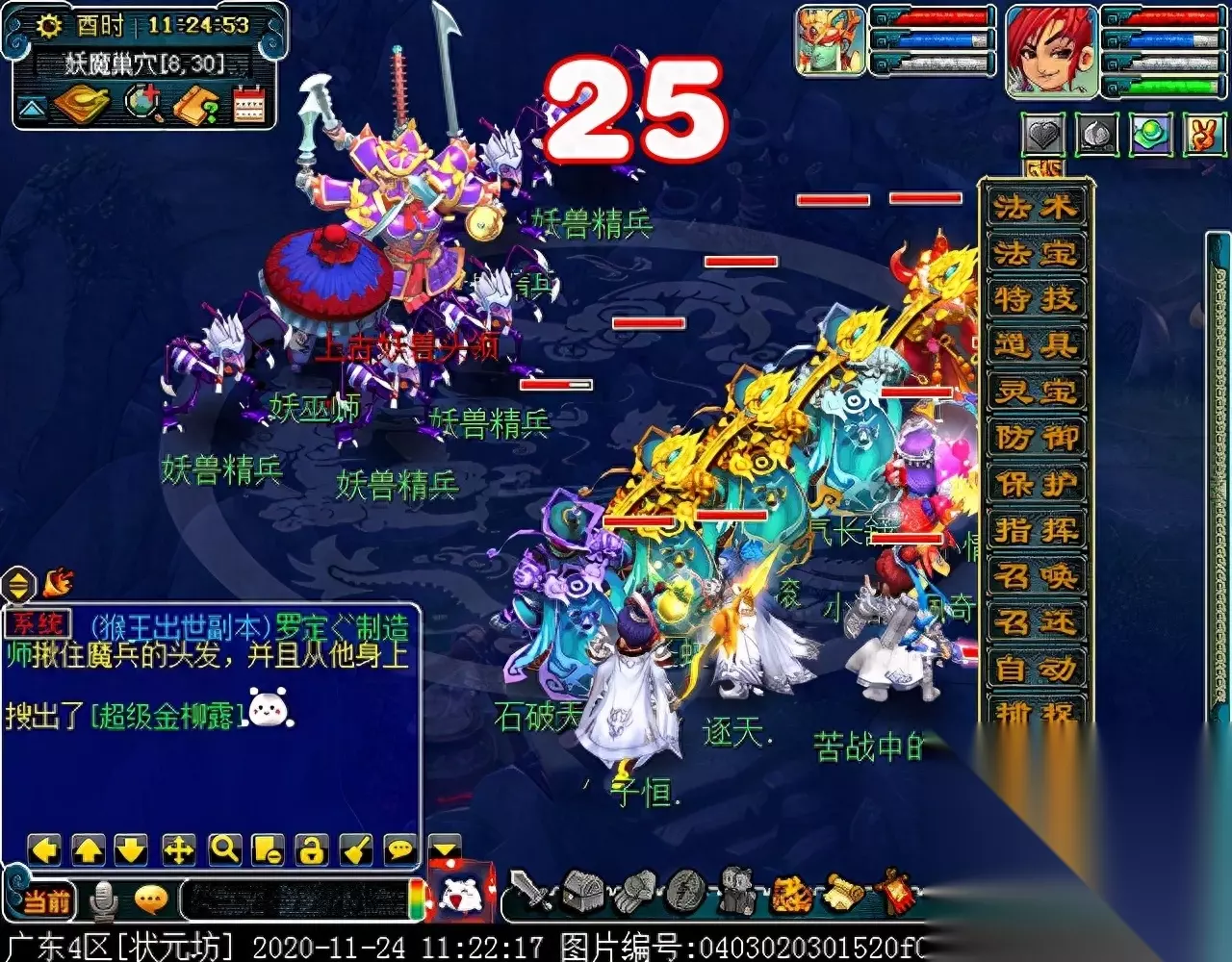 战斗胜利后,如果你是想一队内外夹攻的话,直接点击土地公公传送到妖魔巢穴,后面杀BOSS时当主怪冒泡讲话后,需要领取法宝的玩家跑出来点击魑魅魍魉使用法宝,逃跑出来的玩家会出现在巢穴入口,需要跑上去点,这样的话,跑出去的玩家会损失掉一份奖励。 如果选择小号与队伍内外夹攻的话,那队长就飞出副本场景,这时法宝会消失,小号可以在队伍杀主怪时跑去幻化的观音那重新领取法宝,协助击杀主怪,笔者选择的是后一种方式。 下面开始清理小怪。