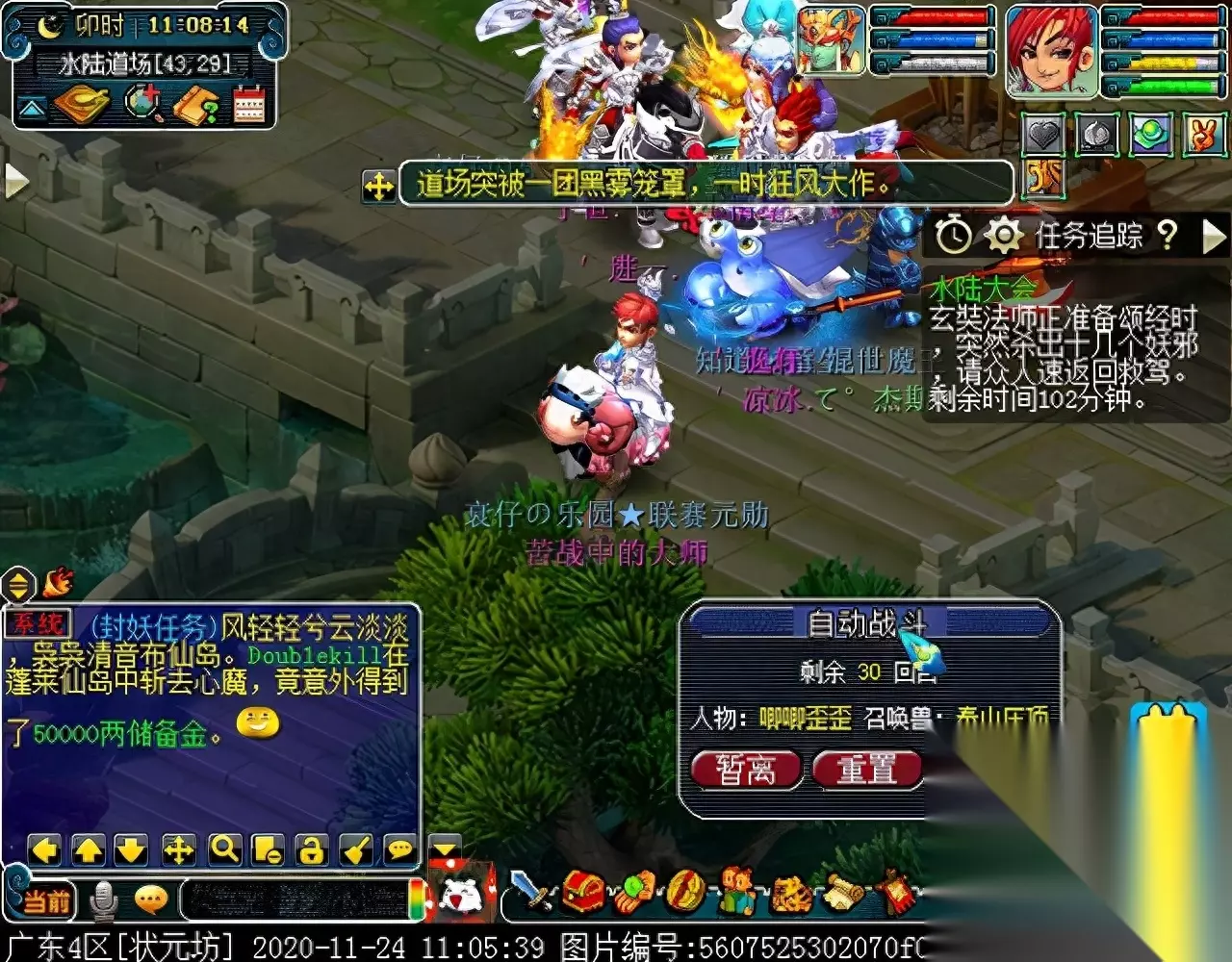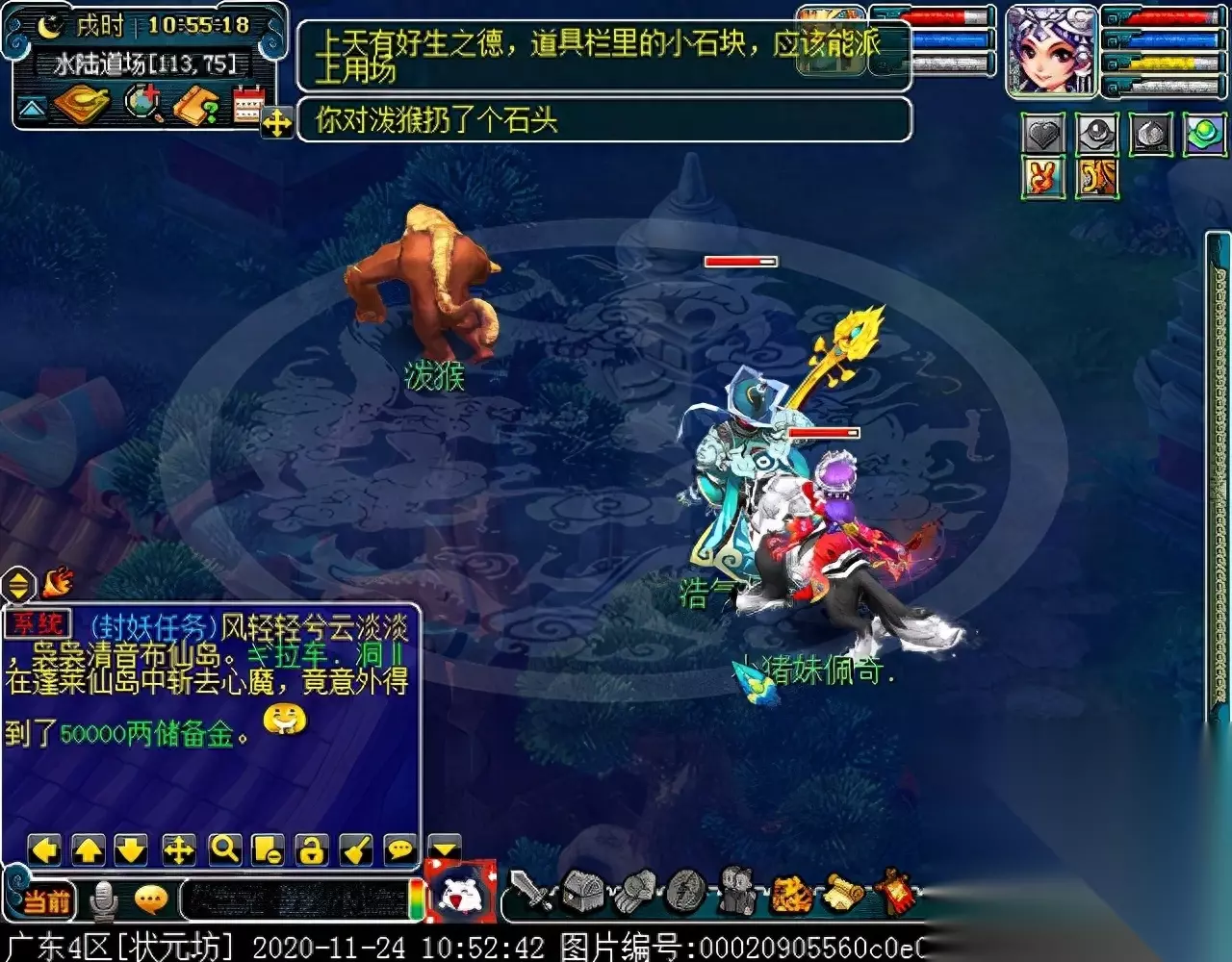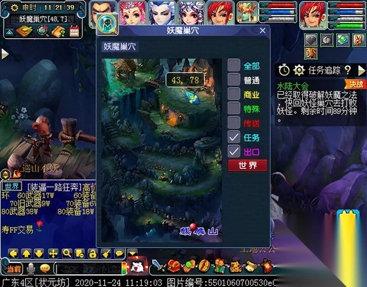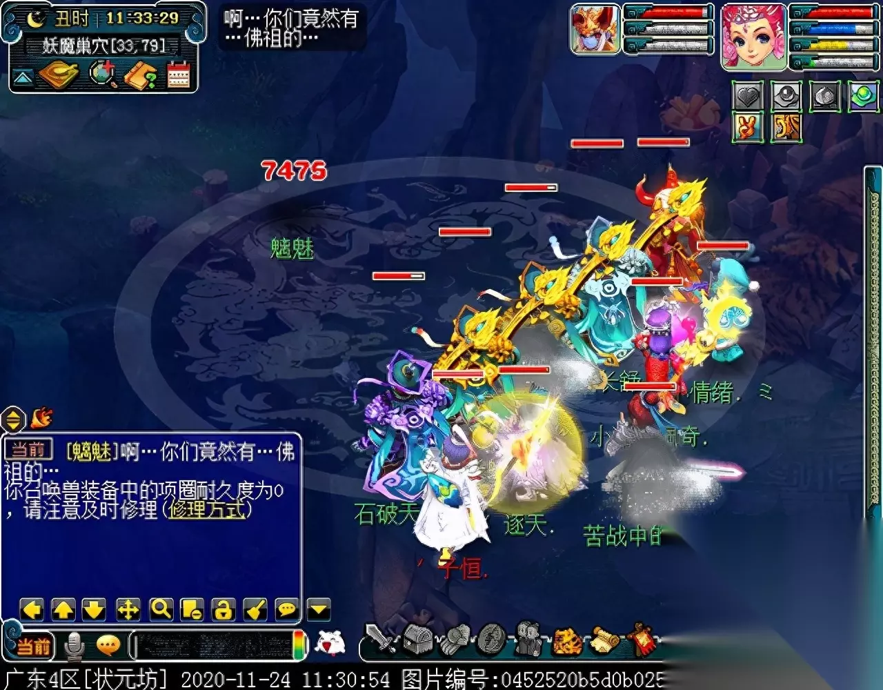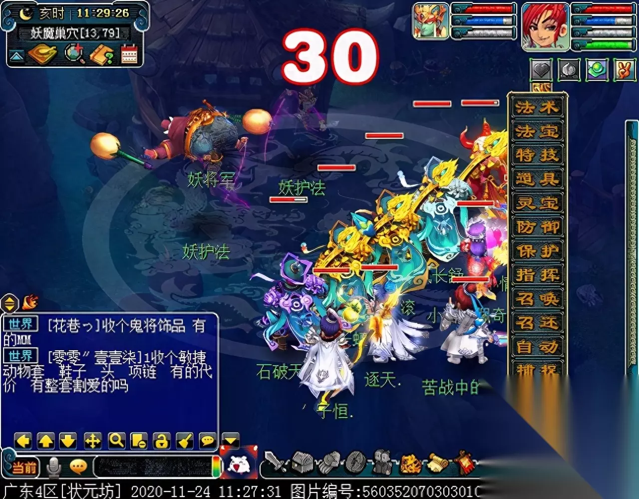 战斗胜利后,如果你是想一队内外夹攻的话,直接点击土地公公传送到妖魔巢穴,后面杀BOSS时当主怪冒泡讲话后,需要领取法宝的玩家跑出来点击魑魅魍魉使用法宝,逃跑出来的玩家会出现在巢穴入口,需要跑上去点,这样的话,跑出去的玩家会损失掉一份奖励。 如果选择小号与队伍内外夹攻的话,那队长就飞出副本场景,这时法宝会消失,小号可以在队伍杀主怪时跑去幻化的观音那重新领取法宝,协助击杀主怪,笔者选择的是后一种方式。 下面开始清理小怪。