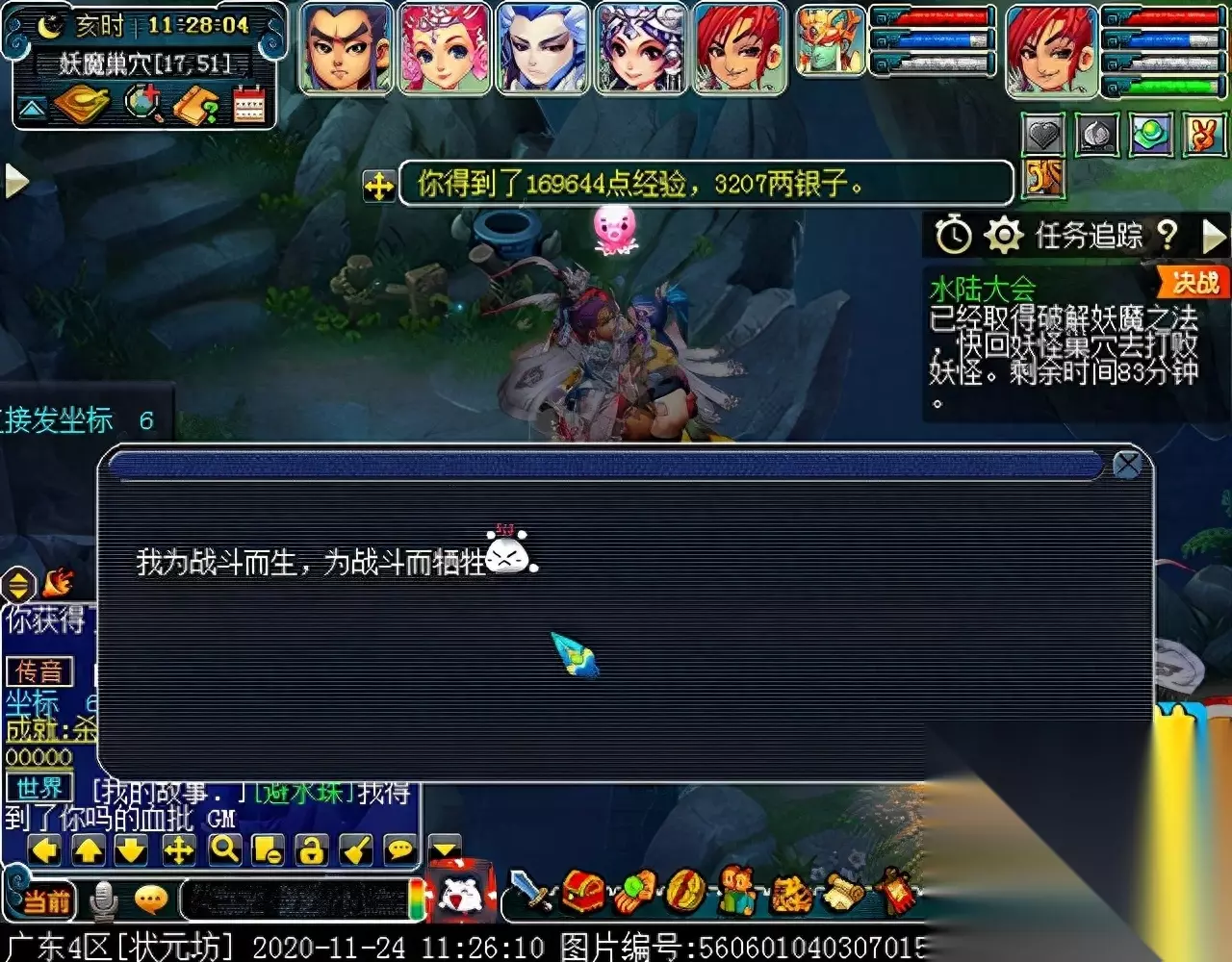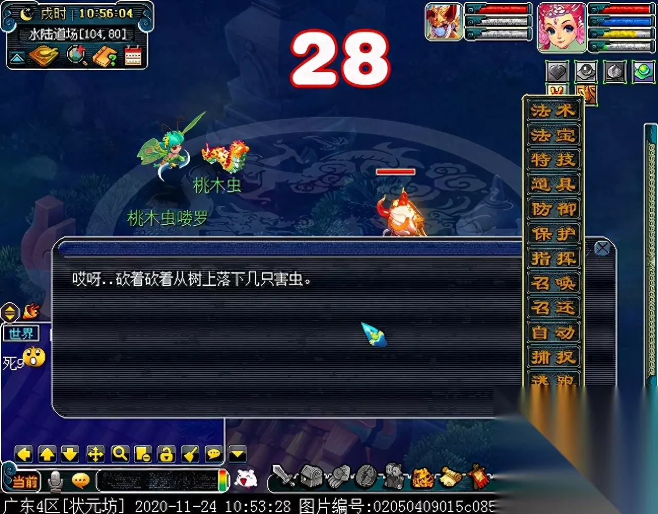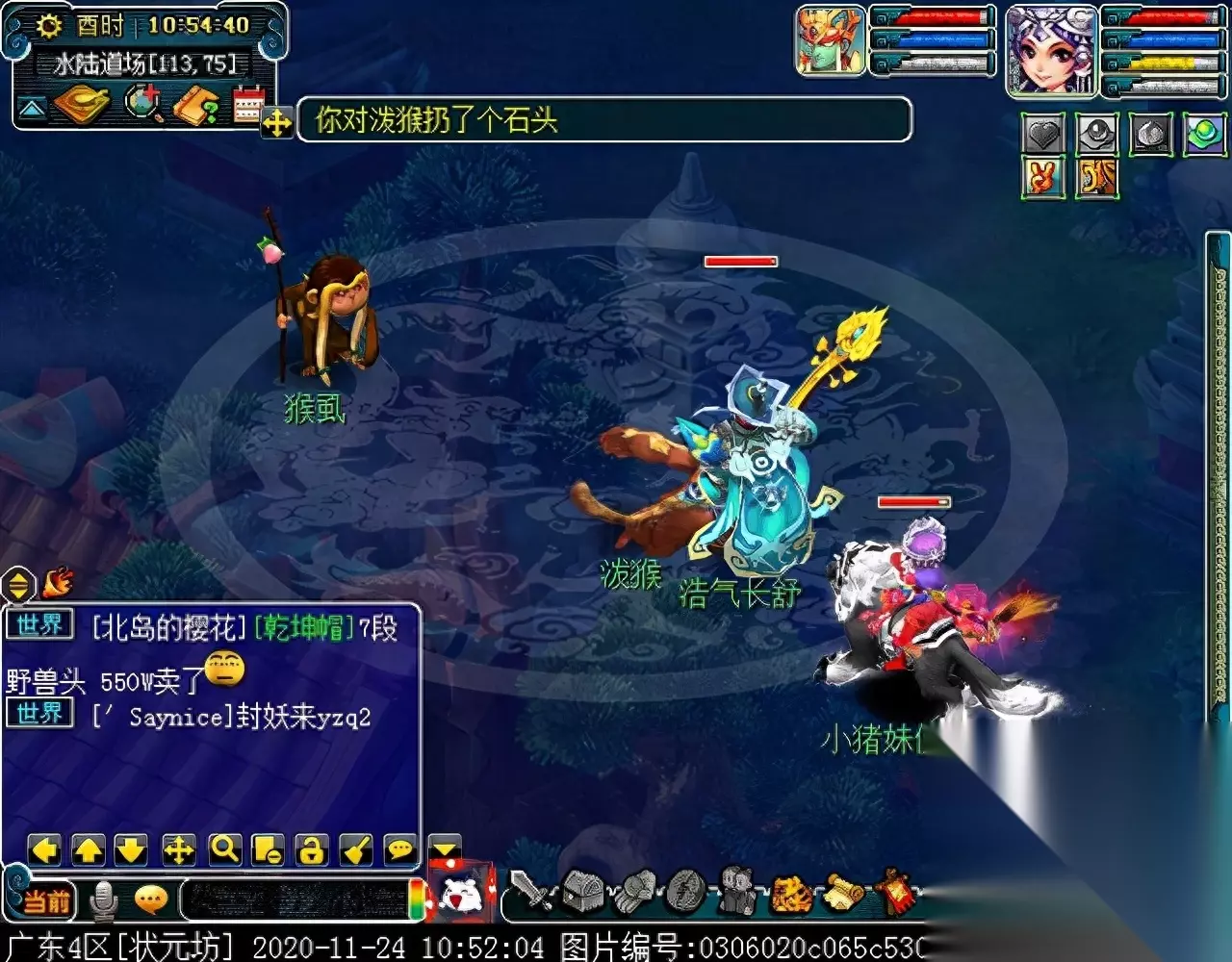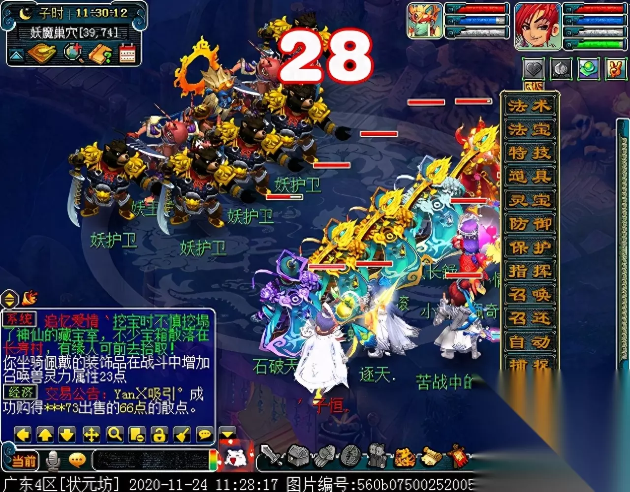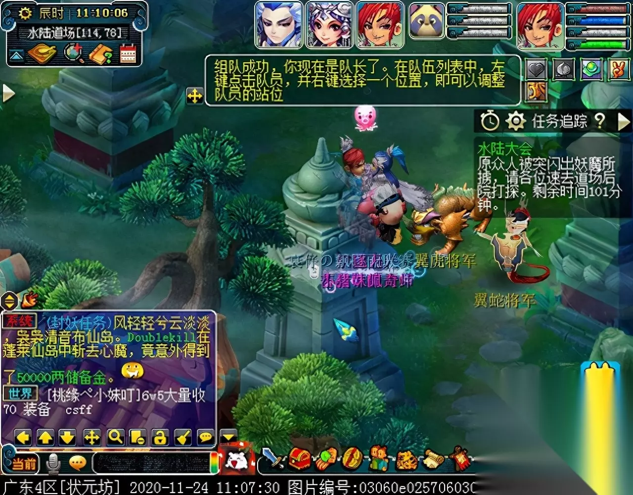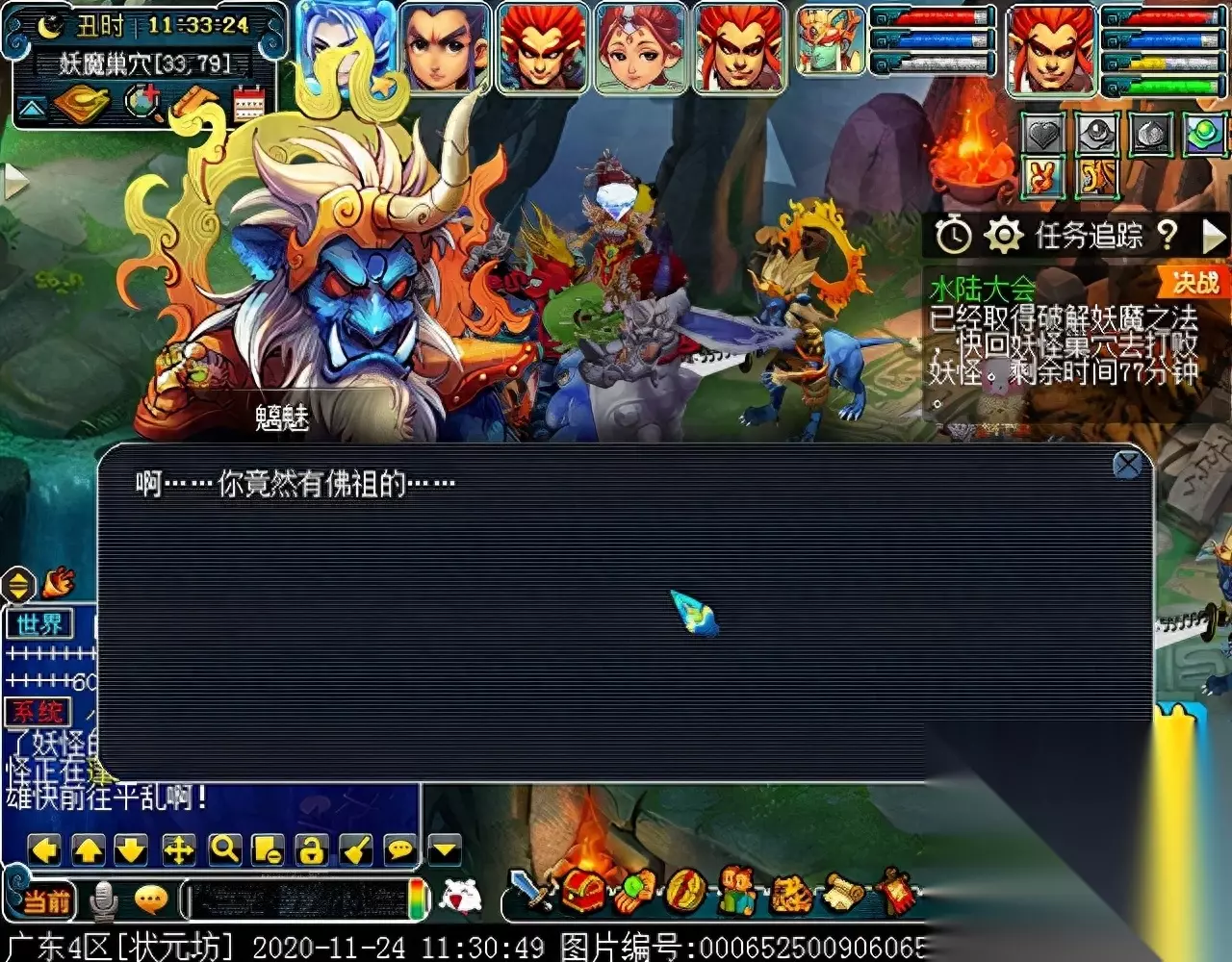 战斗胜利后,如果你是想一队内外夹攻的话,直接点击土地公公传送到妖魔巢穴,后面杀BOSS时当主怪冒泡讲话后,需要领取法宝的玩家跑出来点击魑魅魍魉使用法宝,逃跑出来的玩家会出现在巢穴入口,需要跑上去点,这样的话,跑出去的玩家会损失掉一份奖励。 如果选择小号与队伍内外夹攻的话,那队长就飞出副本场景,这时法宝会消失,小号可以在队伍杀主怪时跑去幻化的观音那重新领取法宝,协助击杀主怪,笔者选择的是后一种方式。 下面开始清理小怪。