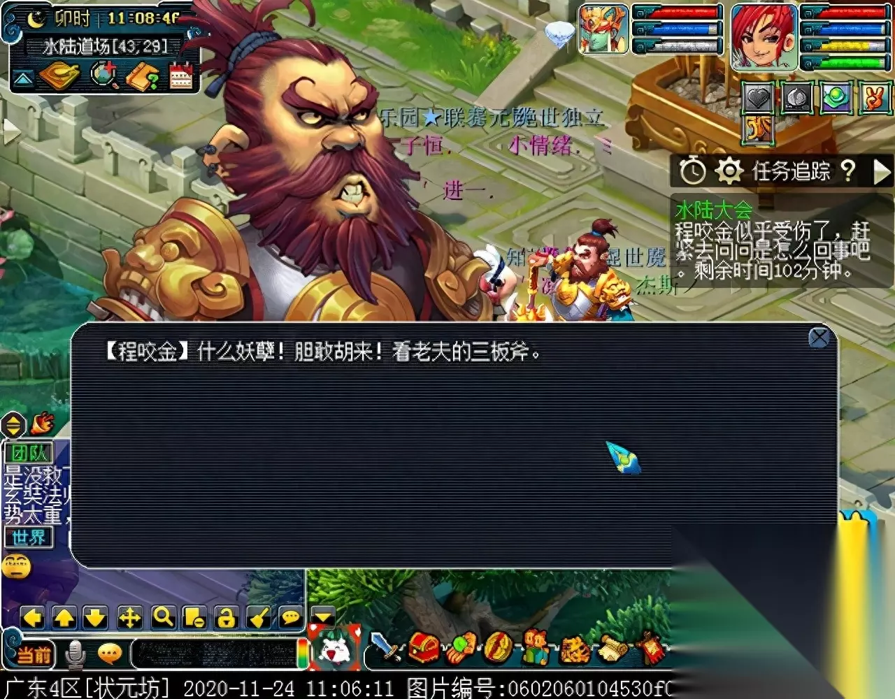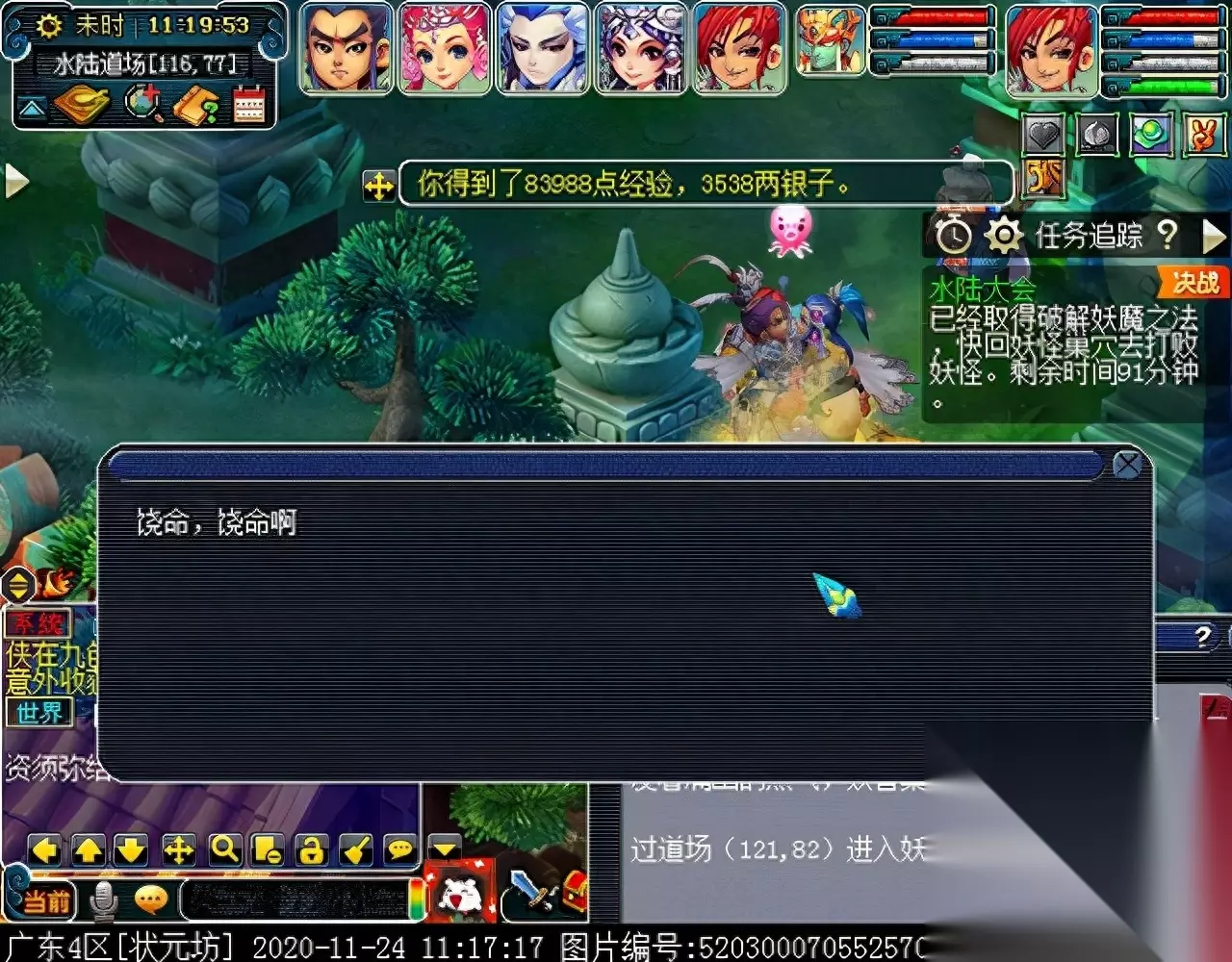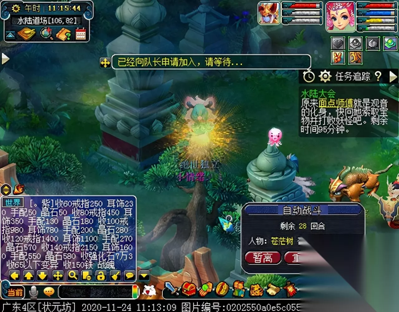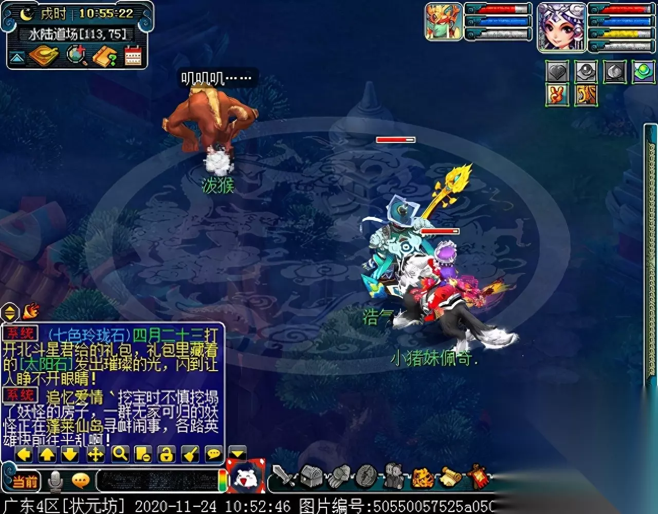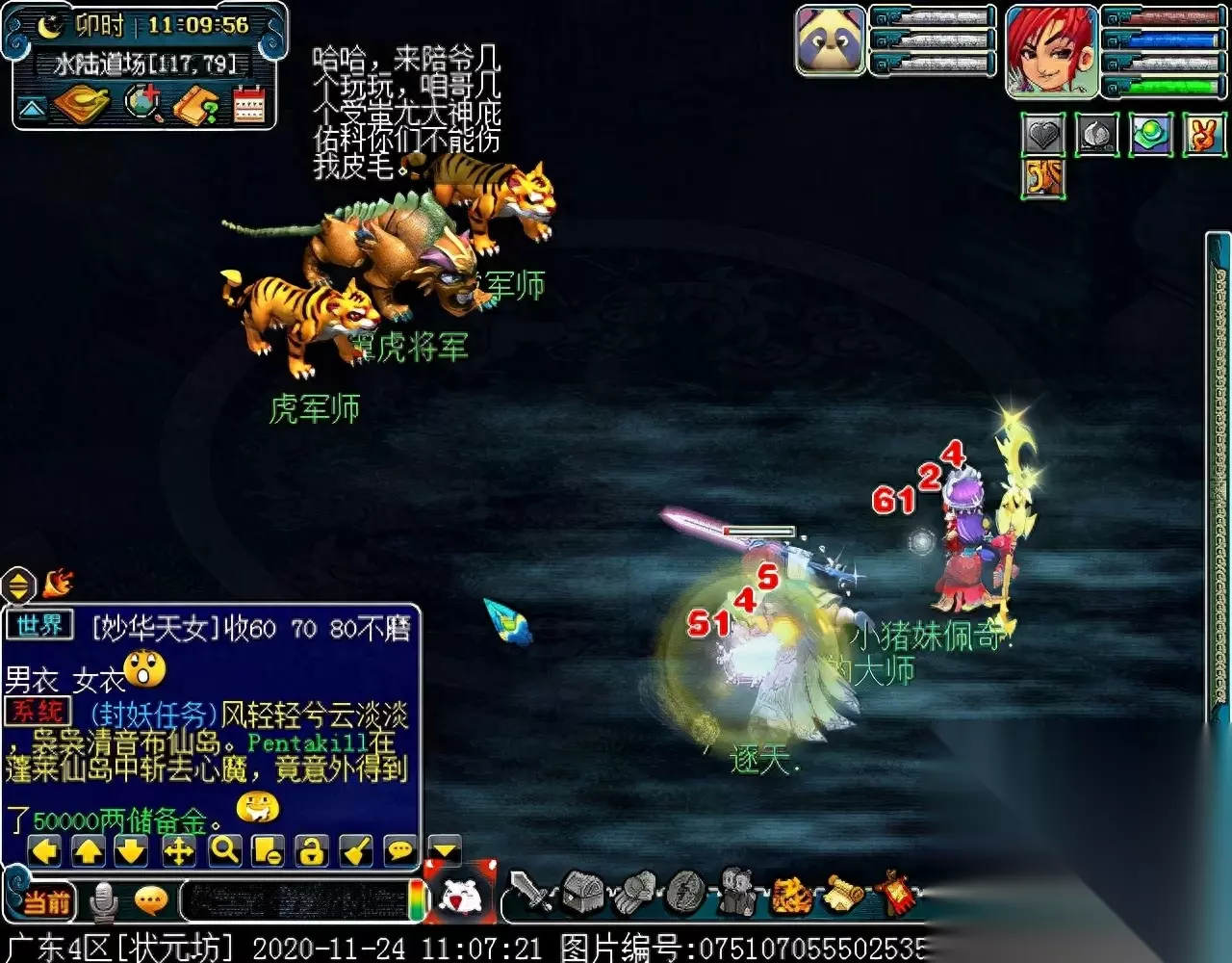 战斗胜利后,如果你是想一队内外夹攻的话,直接点击土地公公传送到妖魔巢穴,后面杀BOSS时当主怪冒泡讲话后,需要领取法宝的玩家跑出来点击魑魅魍魉使用法宝,逃跑出来的玩家会出现在巢穴入口,需要跑上去点,这样的话,跑出去的玩家会损失掉一份奖励。 如果选择小号与队伍内外夹攻的话,那队长就飞出副本场景,这时法宝会消失,小号可以在队伍杀主怪时跑去幻化的观音那重新领取法宝,协助击杀主怪,笔者选择的是后一种方式。 下面开始清理小怪。