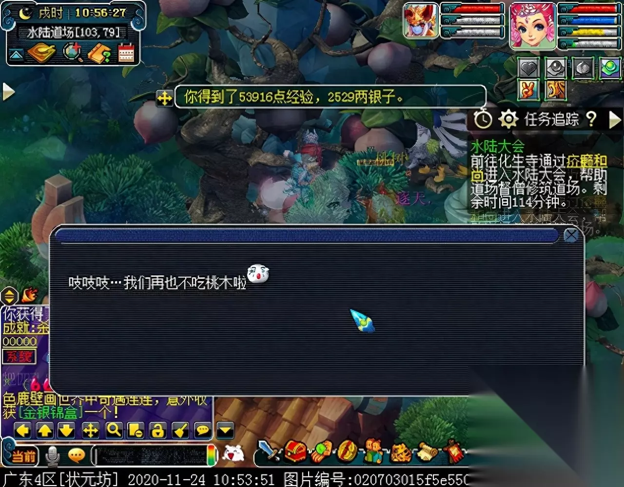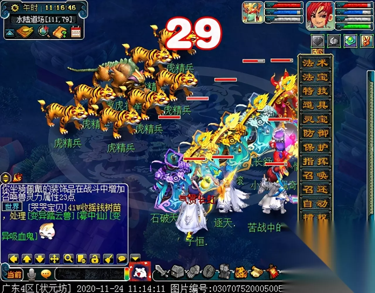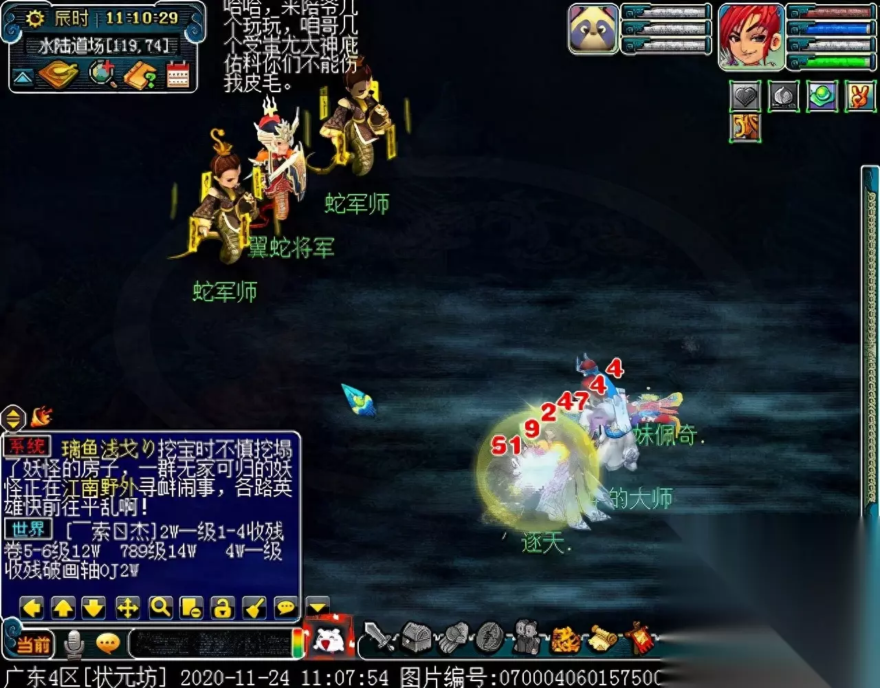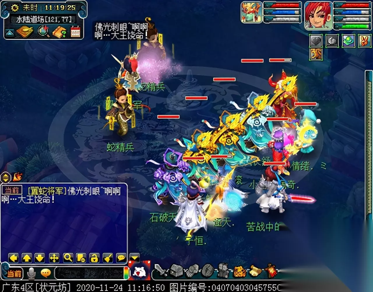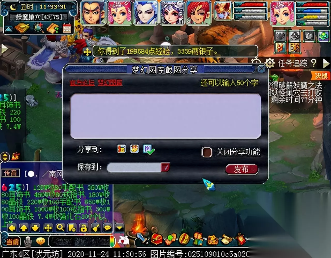 战斗胜利后,如果你是想一队内外夹攻的话,直接点击土地公公传送到妖魔巢穴,后面杀BOSS时当主怪冒泡讲话后,需要领取法宝的玩家跑出来点击魑魅魍魉使用法宝,逃跑出来的玩家会出现在巢穴入口,需要跑上去点,这样的话,跑出去的玩家会损失掉一份奖励。 如果选择小号与队伍内外夹攻的话,那队长就飞出副本场景,这时法宝会消失,小号可以在队伍杀主怪时跑去幻化的观音那重新领取法宝,协助击杀主怪,笔者选择的是后一种方式。 下面开始清理小怪。