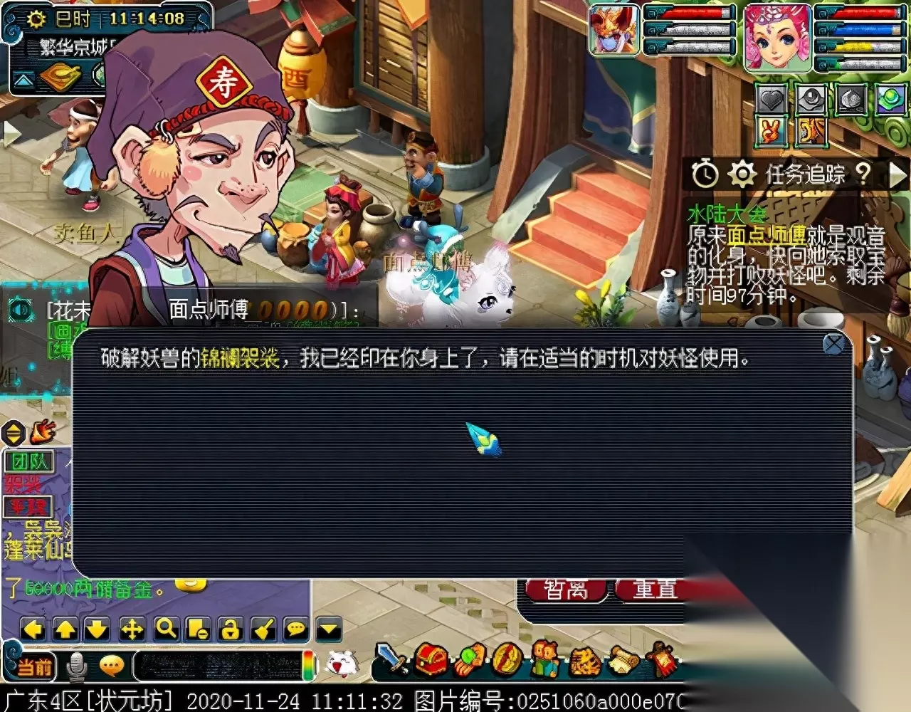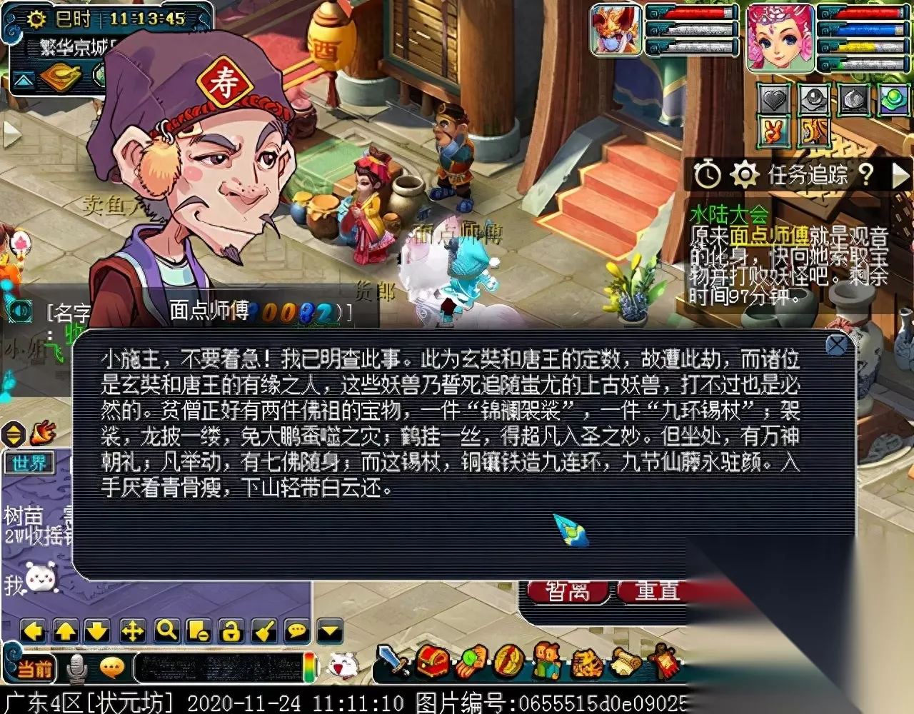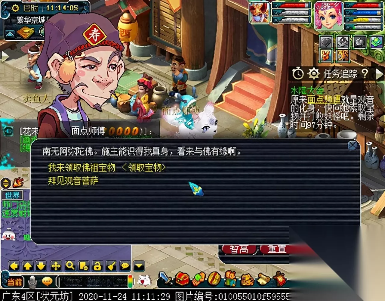 测试队伍发现面点师傅是观音的化身,对话后领取法宝。