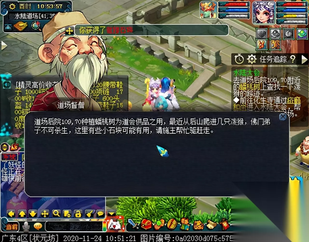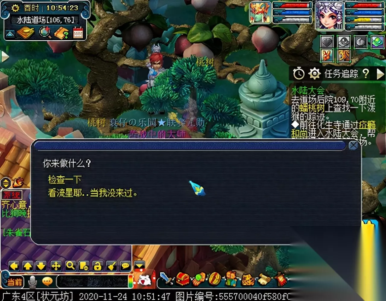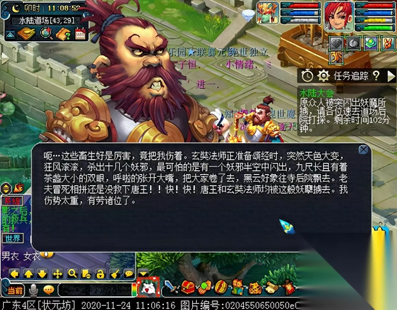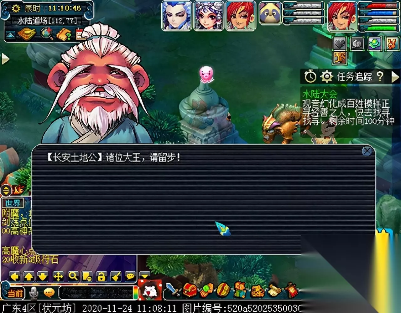 当出现土地公公的对话时,留待长安的两个号可以开始找人了。 观音姐姐会幻化成百姓的模样,出现在繁华京城的右下角区域,下述百姓都有可能是观音幻化的,当找到幻化的观音后,对话可以获得击败BOSS的方法,同时两人可各自获得一件法宝。领取法宝后,注意不要飞出副本场景,否则法宝会消失,需要从该场景跑回水陆道场,NPC坐标如下: 代笔师爷(492,152)、瓜农(476,160)、绣女(478,135)、卖艺者(436,102)、乞丐乙(377,65)、阿咪(383,61)、马商(400,70)、小顽童(410,67)、卖花童(422,60)、(丫鬟、富家小姐、卖鱼人、小馋猫、货郎、面点师傅、针线娘子都相距不远) 、曾衙役(435,33)、大财主(400,53)、游方郎中(380,43)、陈太医(375,35)、樵夫(470,18)。