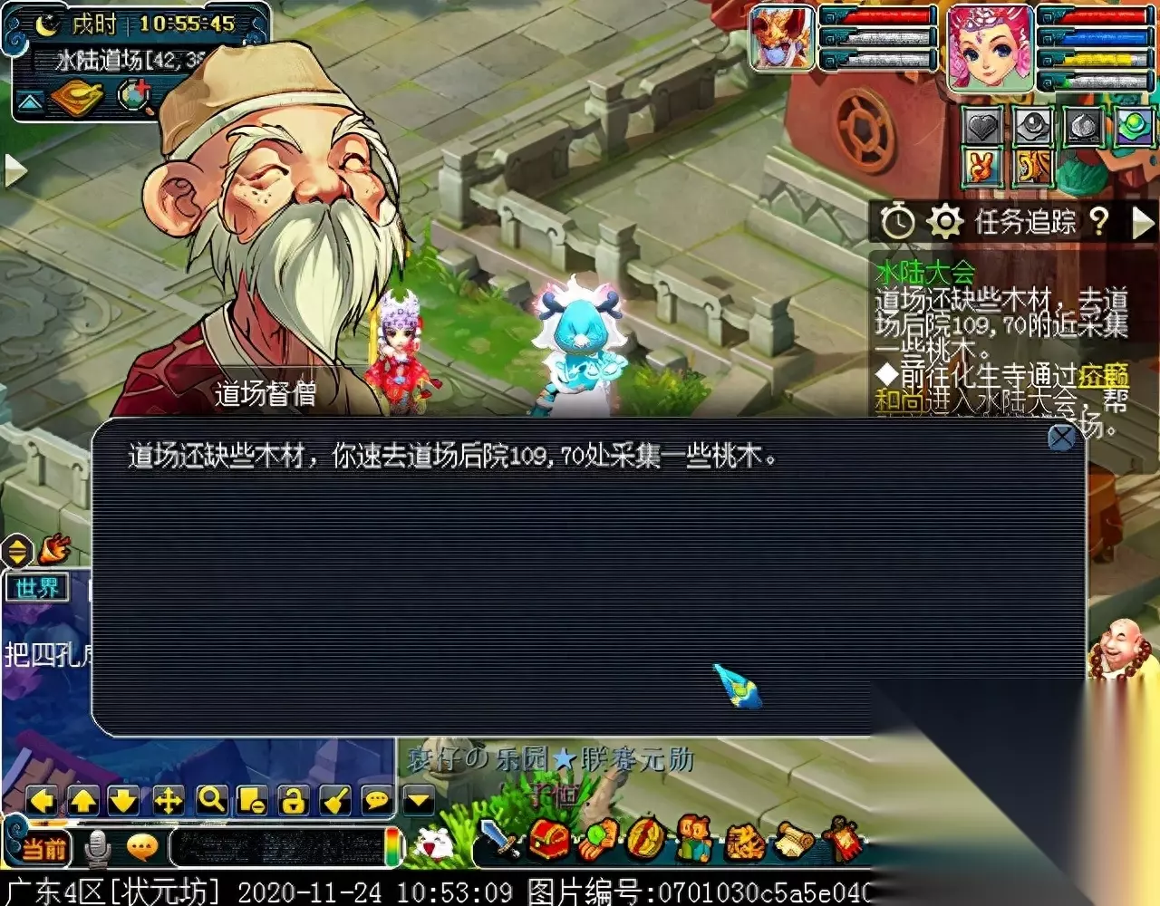 第一环节,帮助道场督僧修筑道场,玩家可以领取“装潢”与“邀请”两类任务,领取装潢的话,需要到后院点击桃树达成;选择邀请的话,需要到繁华京城邀请百姓。