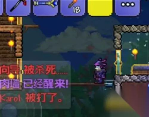 然后铺上一层很长的跑道,注意越长越好!之后在跑道尽头面对岩浆扔下向导人偶,向导会死掉,这个时候玩家不能回城,回城就会死!然后肉山就会从丢下的那个方向出现,随即它被召唤出来了,如下图所示。
