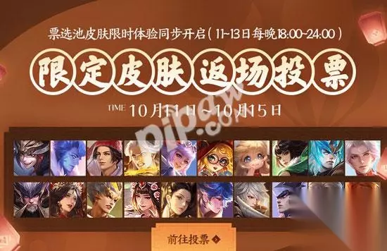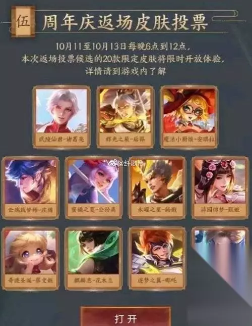 2019年王者荣耀周年庆返场皮肤投票活动于10月11日至13日每晚6点到12点开启,候选返场皮肤有武陵仙君、辉光之辰、魔法小厨娘等20款限定皮肤,玩家可投票决定最终返场皮肤。