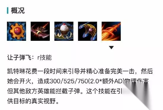 4技能:让子弹飞:凯特琳花费一段时间瞄准敌人并开火,敌人受到伤害会会提供一小段时间视野。凯特琳的超远距离击杀(抢人头?)技能,但需要注意的是,4技能在飞行过程中可以被敌方其他英雄拦截。