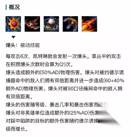 一、技能介绍(由于目前手游中还没有女警的技能,我先以端游技能图片为参考,后续等国服正式更新后,我也会重新放入手游国服的技能图片哦) 被动技能:爆头:在攻击6次后获得一次可造成额外物理伤害的爆头,草丛中的攻击在积攒爆头次数时会算为2次。普攻叠加6次后可获得一次造成额外伤害的普攻,而在草丛里只要普通3次便可,所以在对线时可以利用好这一点进行消耗换血。