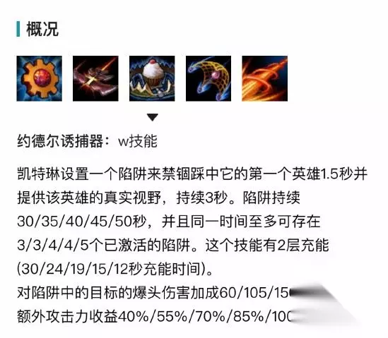 2技能:约德尔诱捕器:凯特琳在地上放置一个陷阱,如果敌方英雄踩到会被短暂禁锢并提供视野。同时敌方英雄在踩到陷阱后凯特琳可以获得一次爆头伤害。在使用女警时可以利用好2技能,草丛可以放置避免被敌方打野GANK,同时可以在敌方防御塔视野盲区放置,敌方在补塔刀时也容易踩中夹子。