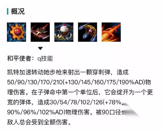 1技能:和平使者:凯特琳用步枪向前射出一颗长距离穿刺弹并造成物理伤害。在命中第一个单位后会提升弹体宽度并造成额外伤害。凯特琳主要的消耗、输出技能。1技能距离远同时伤害可观,但需要注意,1技能是有抬手动作的,敌方很容易就可以躲避,最好是在敌方被控制或是禁锢后再使用,提升命中率。