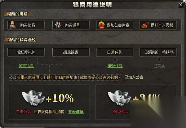 获取方法 一、任务活跃度奖励 完成每日的日常任务达到指定的活跃度就可以获得银两。 玩家的公会等级比较高还会有额外的银两加成,每日首胜可以获得50银两。