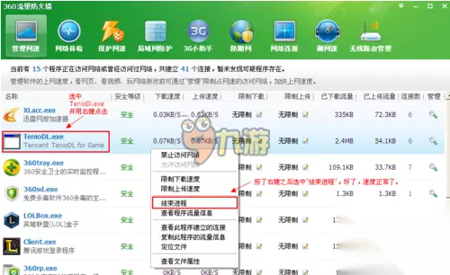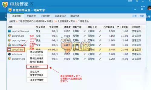 选中"teniodl.exe",用鼠标右键点击,再点击"结束进程",OK。