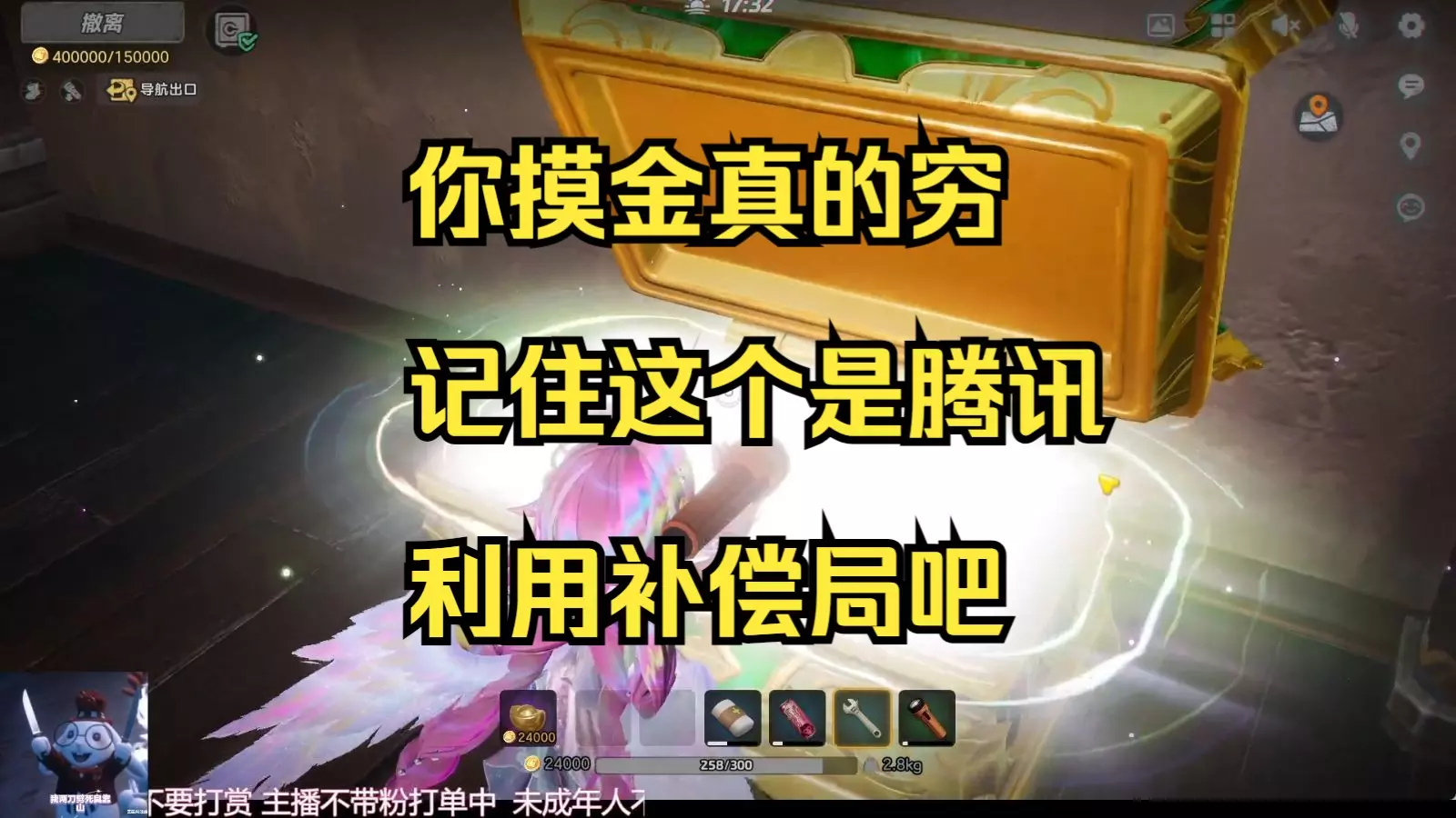 这是《探灵实录》的直播切片,主播在游戏中运气不佳,十几把都没开出大金,最后只出了剑,让主播心态崩溃,直播中还提示未成年人不要打赏。