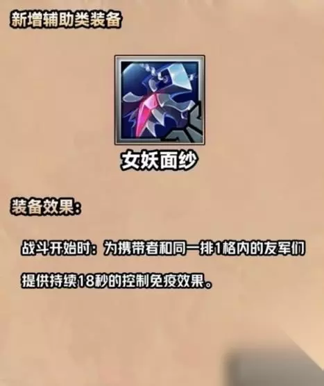 金铲铲之战S9.5女妖面纱装备怎么样 一、装备名称:女妖面纱 二、装备效果:战斗开始时为携带者和同一排1格内的友军门提供持续18秒的控制免疫效果。