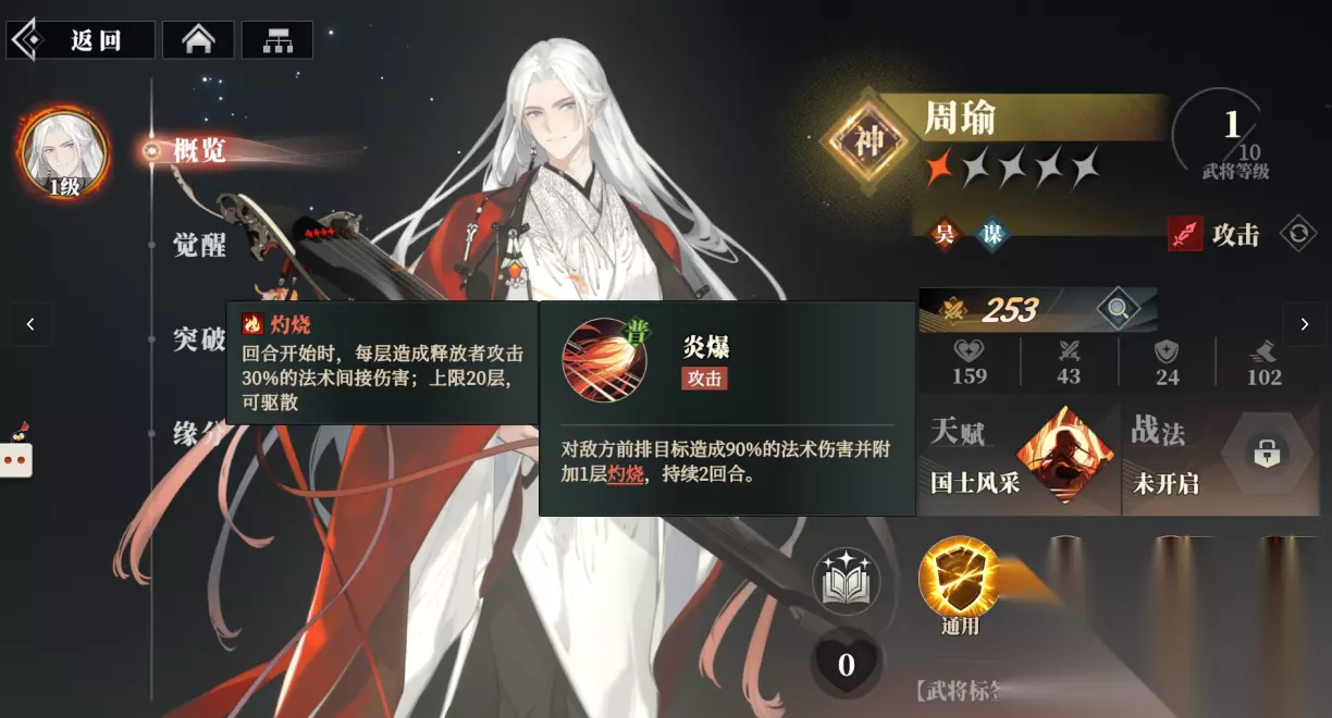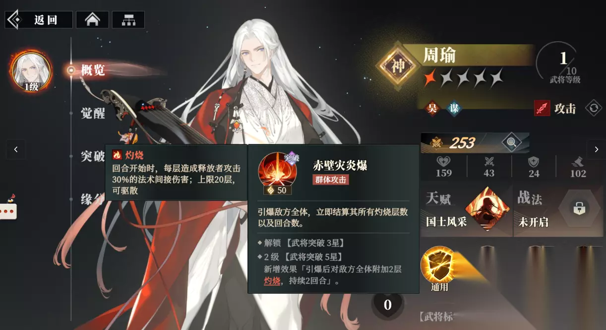 他的突破技“赤壁灾炎爆”会引爆敌方全体,立刻结算目前所有的灼烧层数以及回合数,当武将突破到5星后,还会解锁2级效果在引爆后对敌方全体附加2层会持续2回合的灼烧。